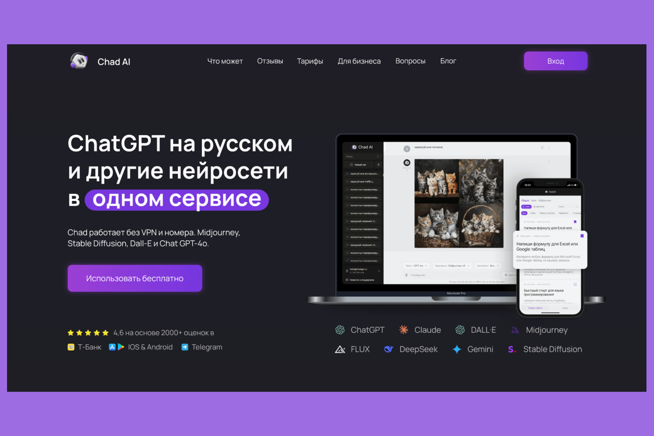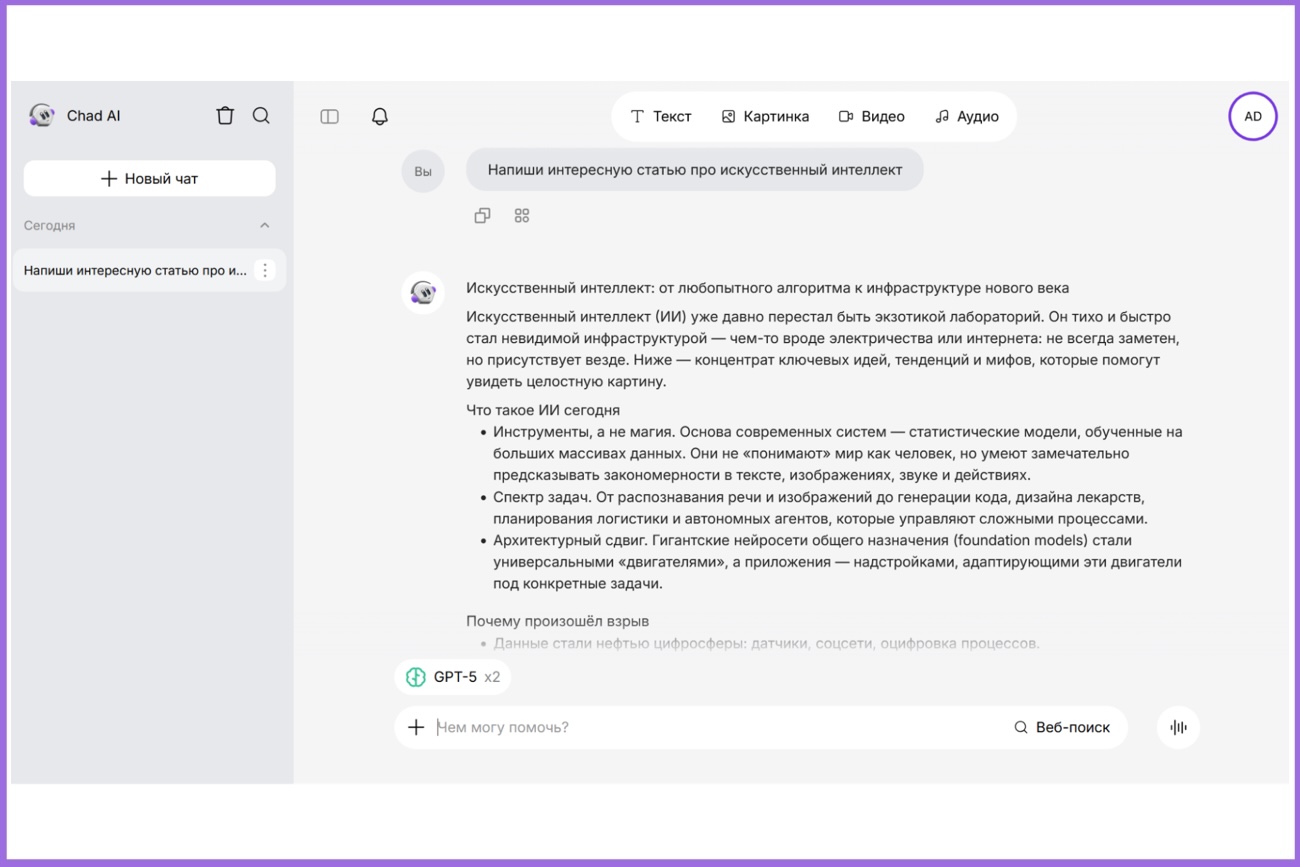 Более 100 нейросетей в одном окне — ChatGPT, Claude, Gemini и другие. Без VPN и зарубежных карт.
