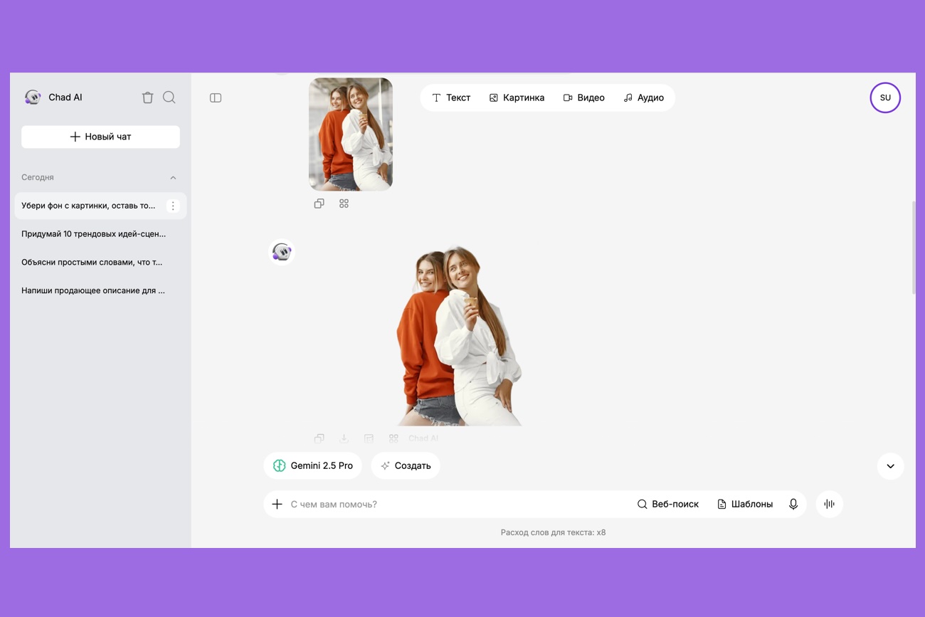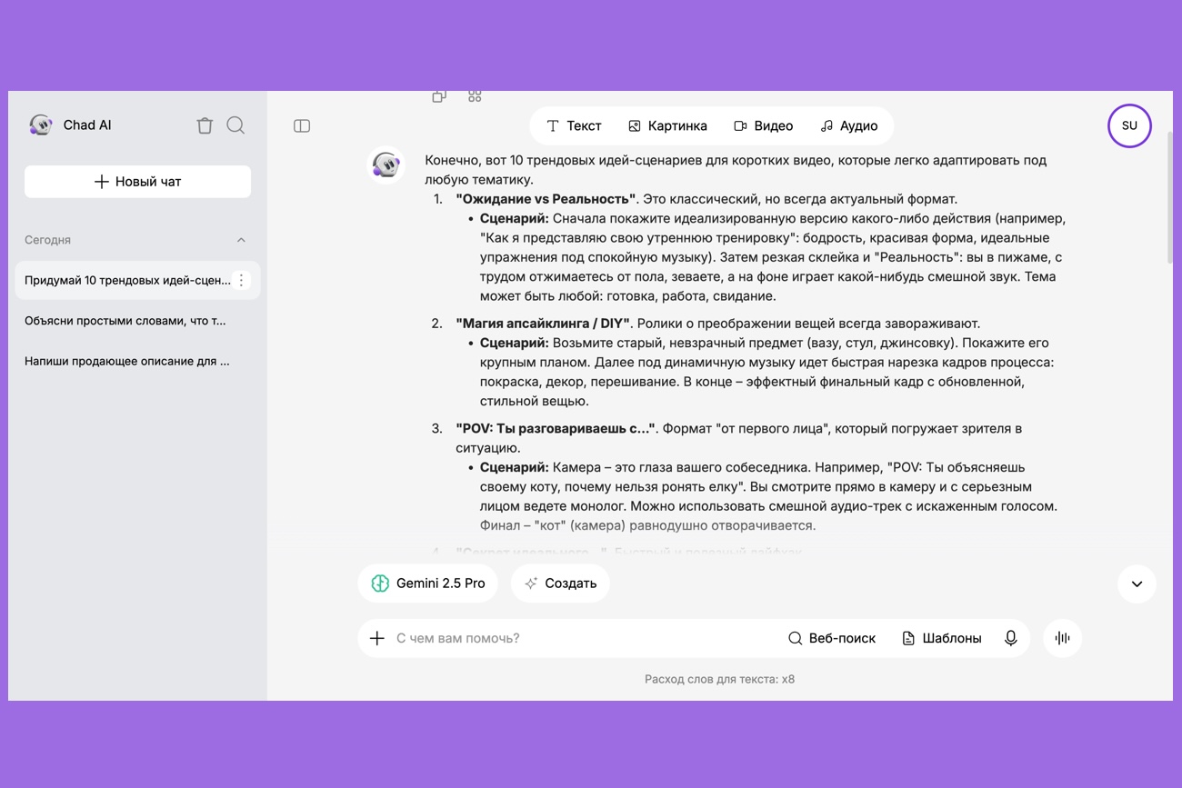 В WebGPT существует баланс «слов» — это валюта, за которую ваш запрос выполнит нейросеть. Расход слов у Gemini 2.5 Pro в 8 раз больше, чем у простых нейросетей, но зато эта модель спокойно справляется с большими массивами данных. Например, в неё можно загрузить «Мастера и Маргариту» и задавать вопросы по тексту.