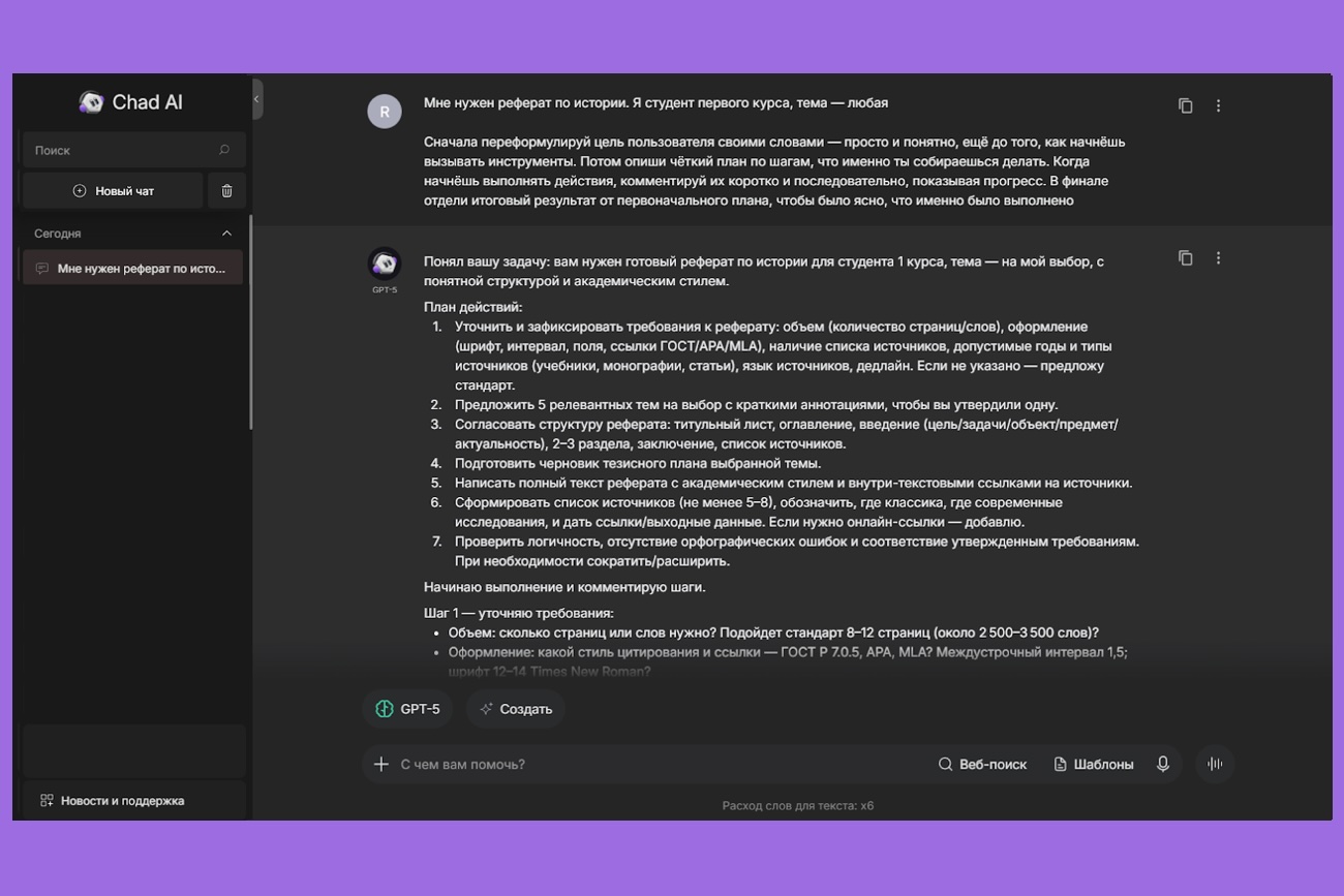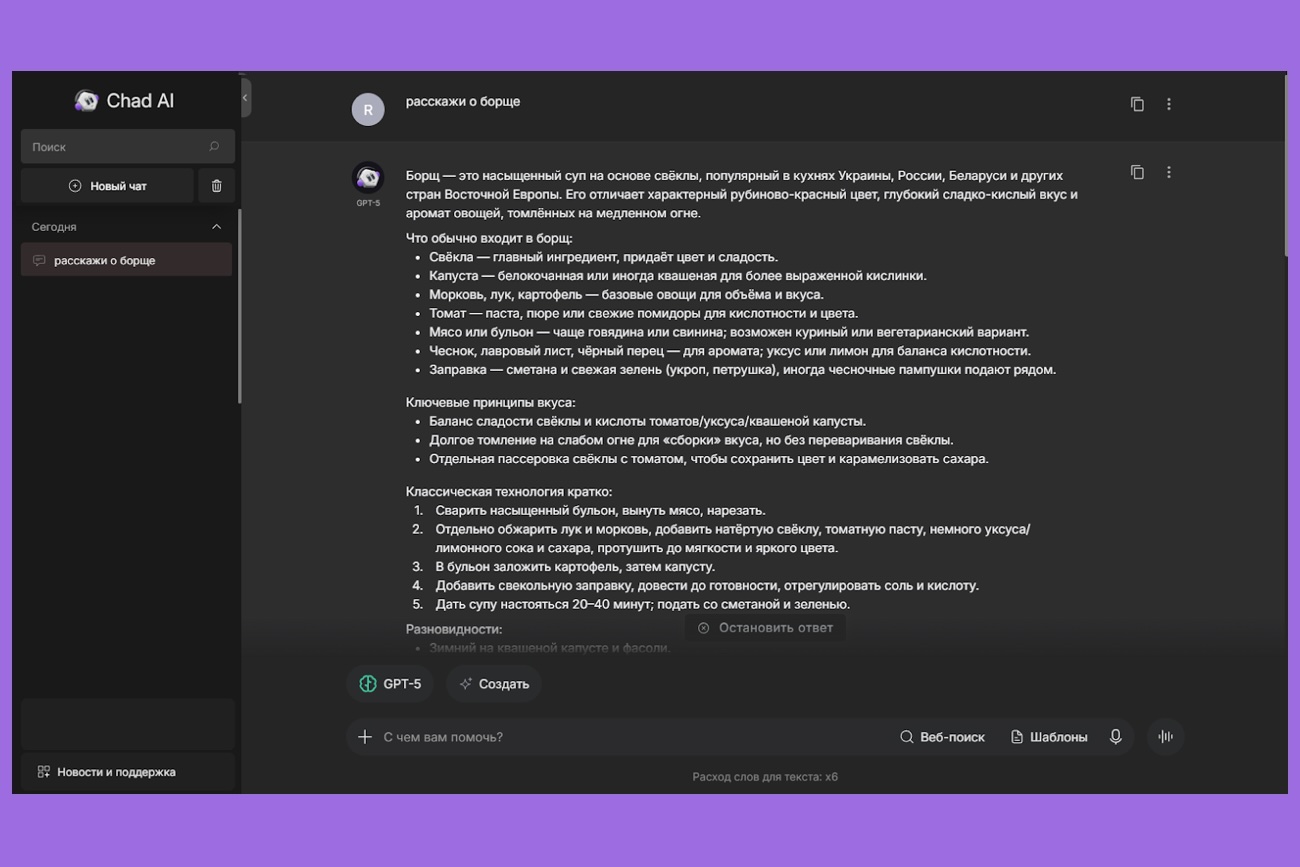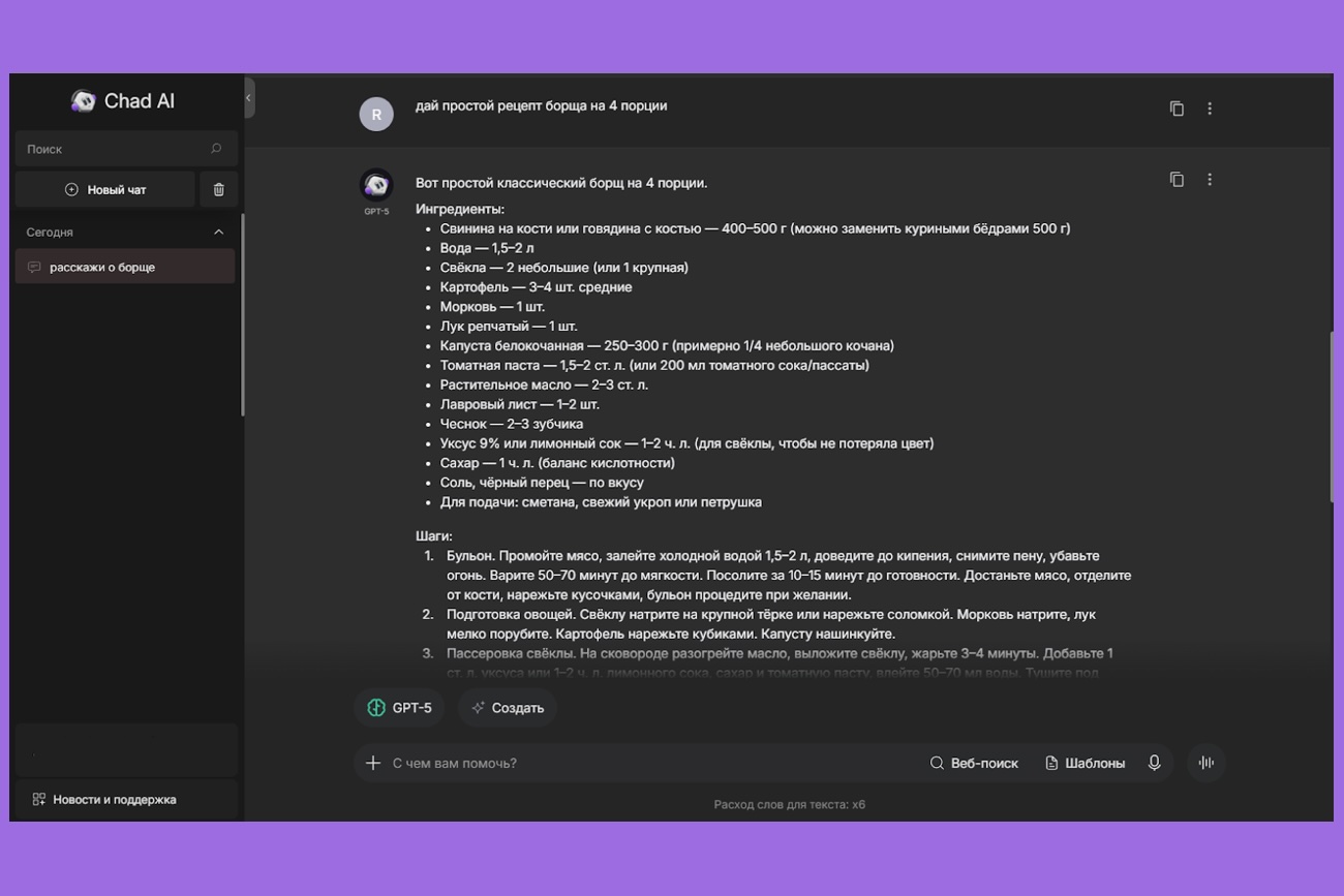 Ставить чёткую задачу. Если отправить запрос «расскажи о борще», GPT-5 начнёт углубляться, раскопает историю блюда, разновидности и сравнит с другими супами. А если уточнить: «дай простой рецепт борща на 4 порции», он сразу выдаст нужный результат без лишних деталей.