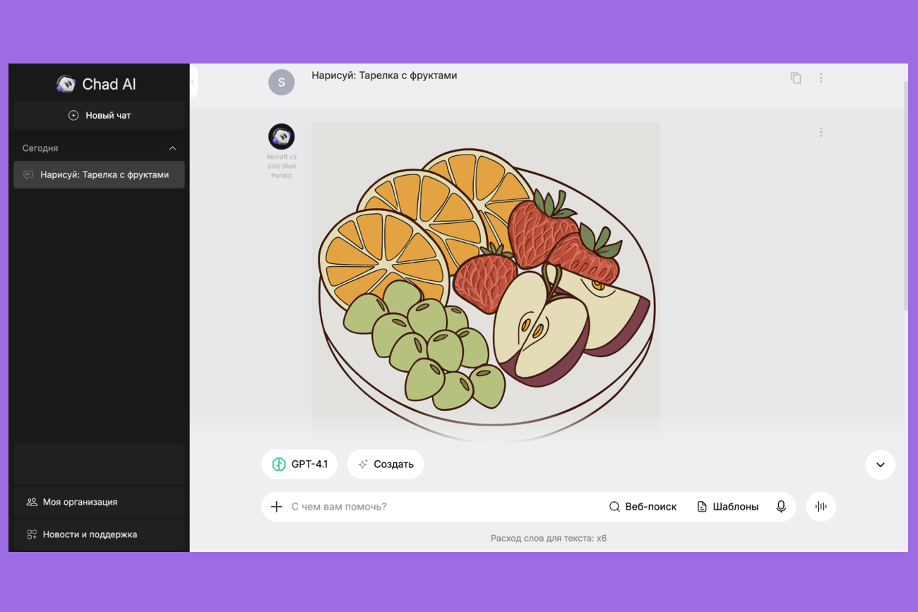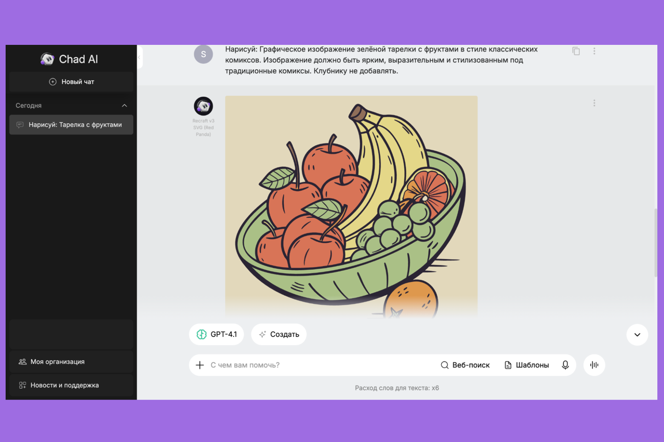 Например, попросим нейросеть Recraft сгенерировать изображение тарелки с фруктами. Работать будем через WebGPT. Это российский сервис, который объединяет популярные нейросети — не только Recraft, но и WebGPT, DeepSeek, Grok, Midjourney и другие. Он позволяет работать с ними на русском языке и оплачивать расширенный доступ с карт банков РФ. Познакомиться с возможностями WebGPT можно в бесплатной версии, а стоимость платных подписок начинается от 290 рублей в месяц.