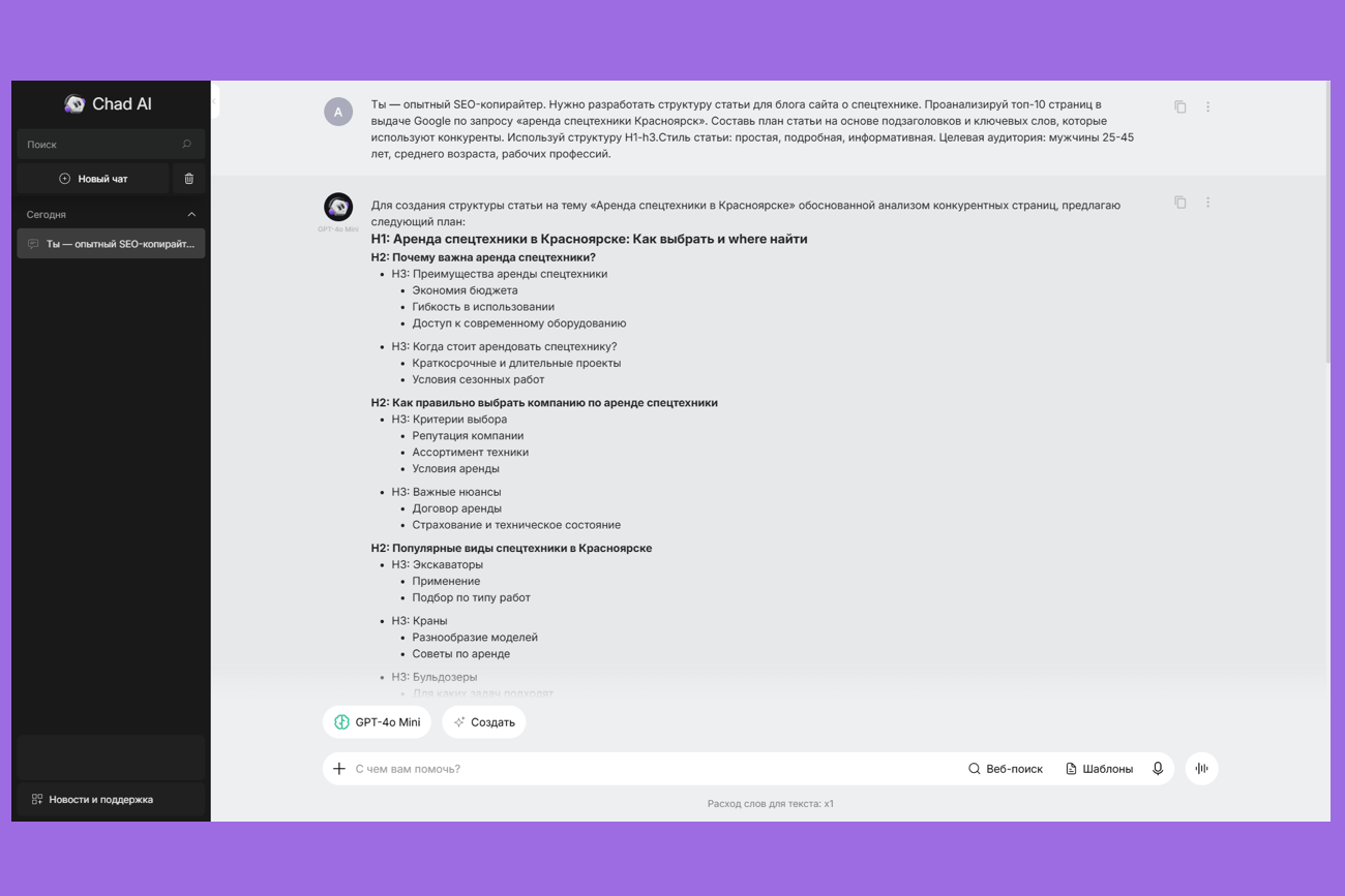 - «Ты — опытный SEO-копирайтер. Нужно разработать структуру статьи для блога сайта о [укажите тему]. Проанализируй топ-10 страниц в выдаче Google по запросу [укажите запрос]. Составь план статьи на основе подзаголовков и ключевых слов, которые используют конкуренты. Используй структуру H1-H3. Ориентируйся на объём статьи в Х знаков. Стиль статьи: [опишите стиль]. Целевая аудитория: [опишите ЦА]».