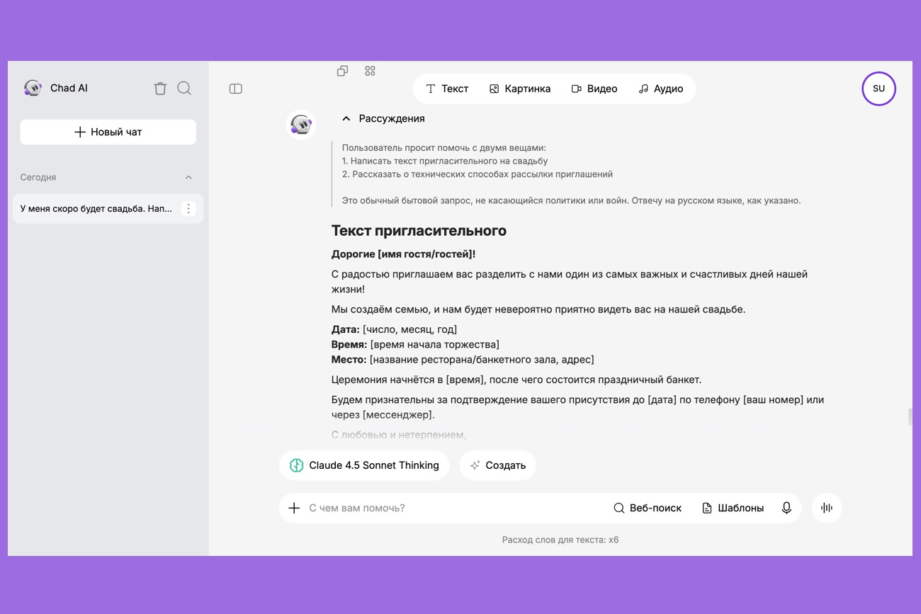 Вот пример, как модель Claude 4.5 Sonnet Thinking ответила на тот же промпт для пригласительных на свадьбу, что был у ChatGPT.