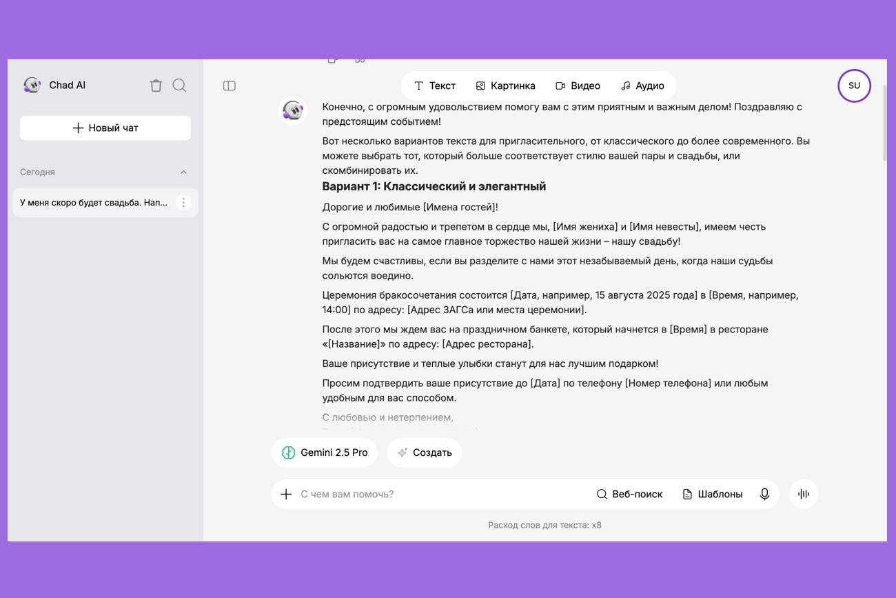 Gemini 2.5 Pro предлагает сразу несколько вариантов пригласительного на свадьбу: классический и современный.