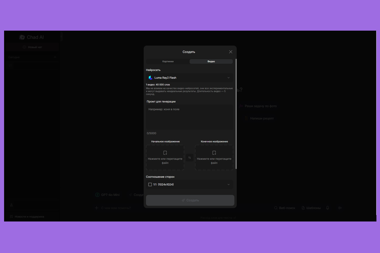 Выберите пункт «Создать» и в специальном окне установите параметры видео. Обратите внимание на список доступных нейросетей для генерации. Они различаются по количеству доступных слов для промпта, длительности видео, времени генерации и языку запроса.