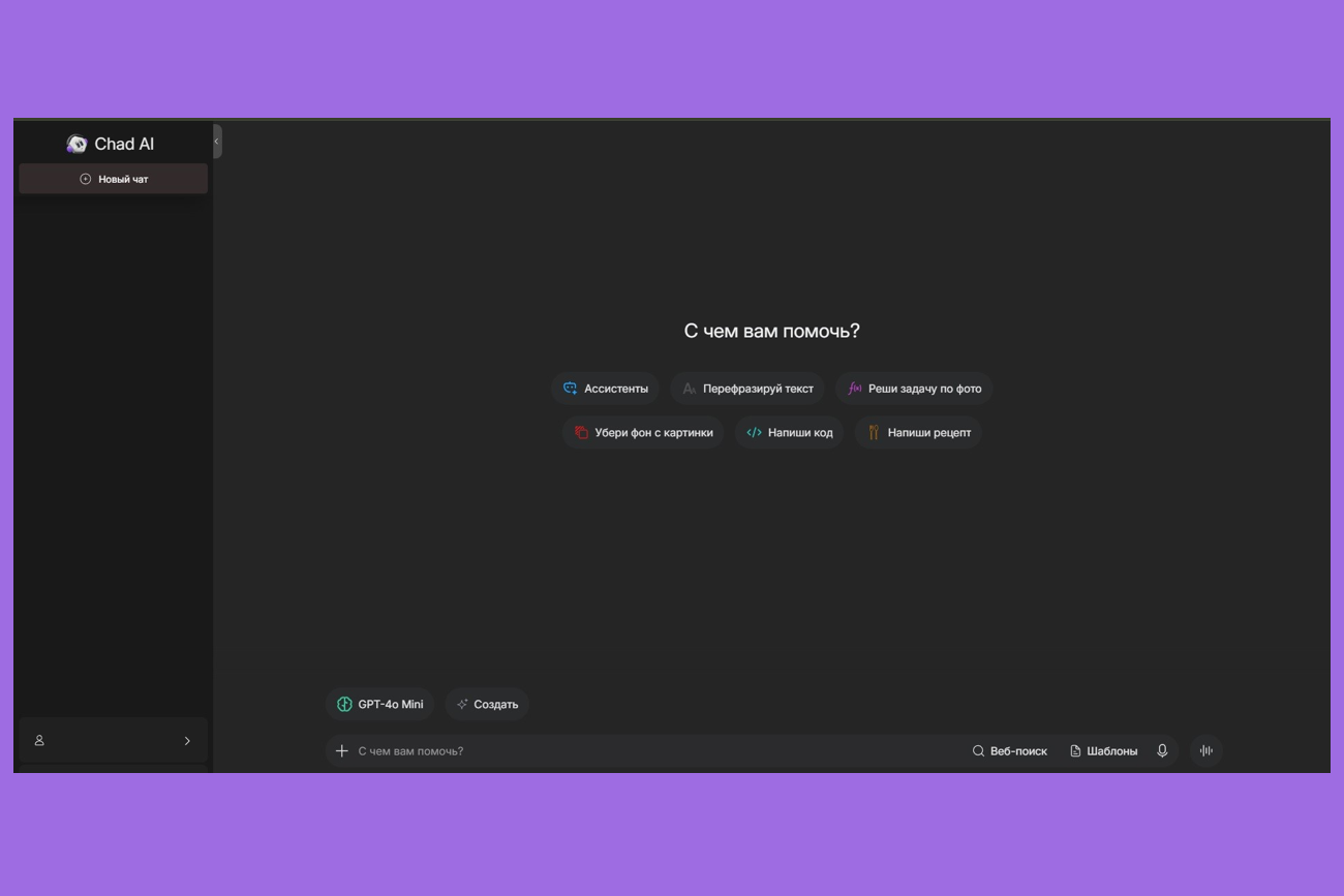 Попробуем создать короткий клип в WebGPT. Этот сервис предлагает большой набор нейросетей для создания видео, а оплатить тарифы можно с российской карты. Пройдите регистрацию и выберите пункт «Новый чат».
