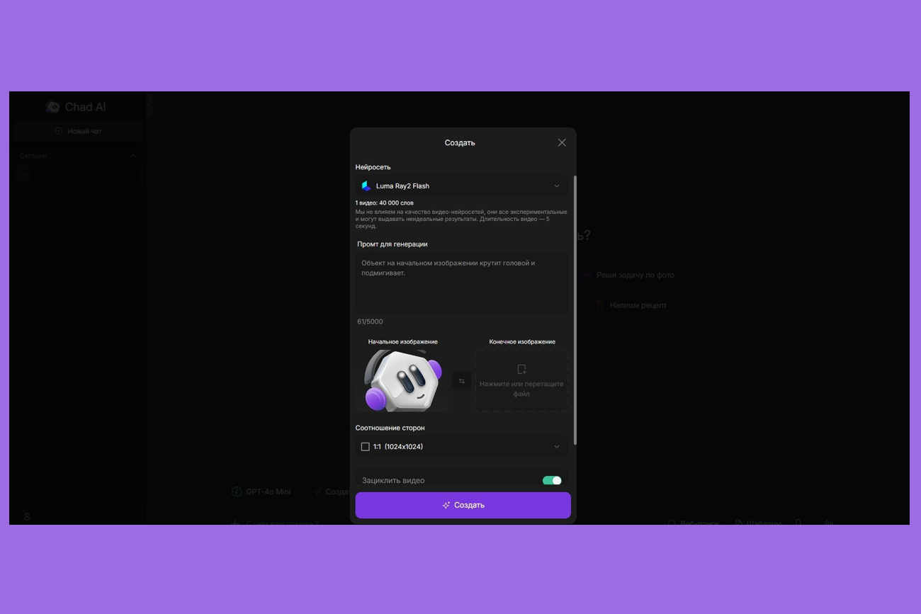 Мы будем работать с Luma Ray2 Flash. Зациклим видео и добавим начальное изображение. Соотношение сторон оставим стандартным — 1:1.