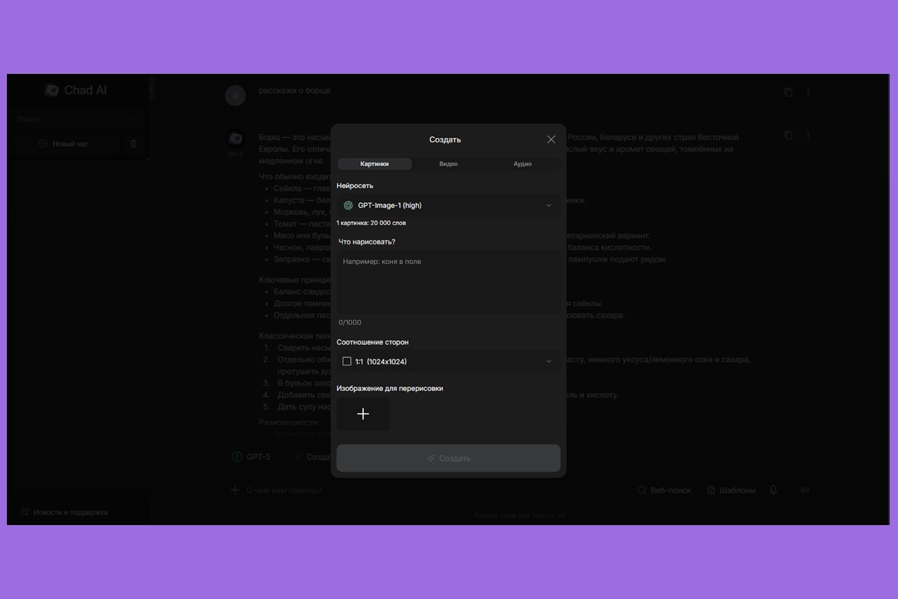 Чтобы создавать картинки, видео и аудио, нажмите на кнопку «Создать». После этого откроется меню, в котором можно выбрать нейросеть, описать задачу, выбрать размер картинки и загрузить свою, чтобы модель её перерисовала.