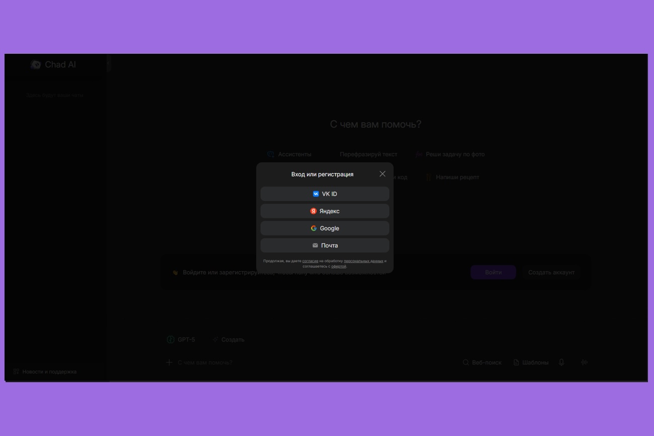 Для начала нужно зарегистрироваться. Вы заходите на сайт WebGPT AI, нажимаете кнопку «Использовать бесплатно», затем указываете свой email и пароль. Также можно войти через аккаунт Google, VK ID или Яндекс — так еще быстрее. После этого вам на почту придет письмо с подтверждением. Перейдите по ссылке — и доступ к сервису открыт.