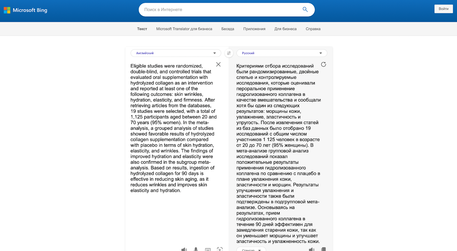 - Первый пример — научный текст на английском языке о влиянии коллагеновых добавок на старение кожи.