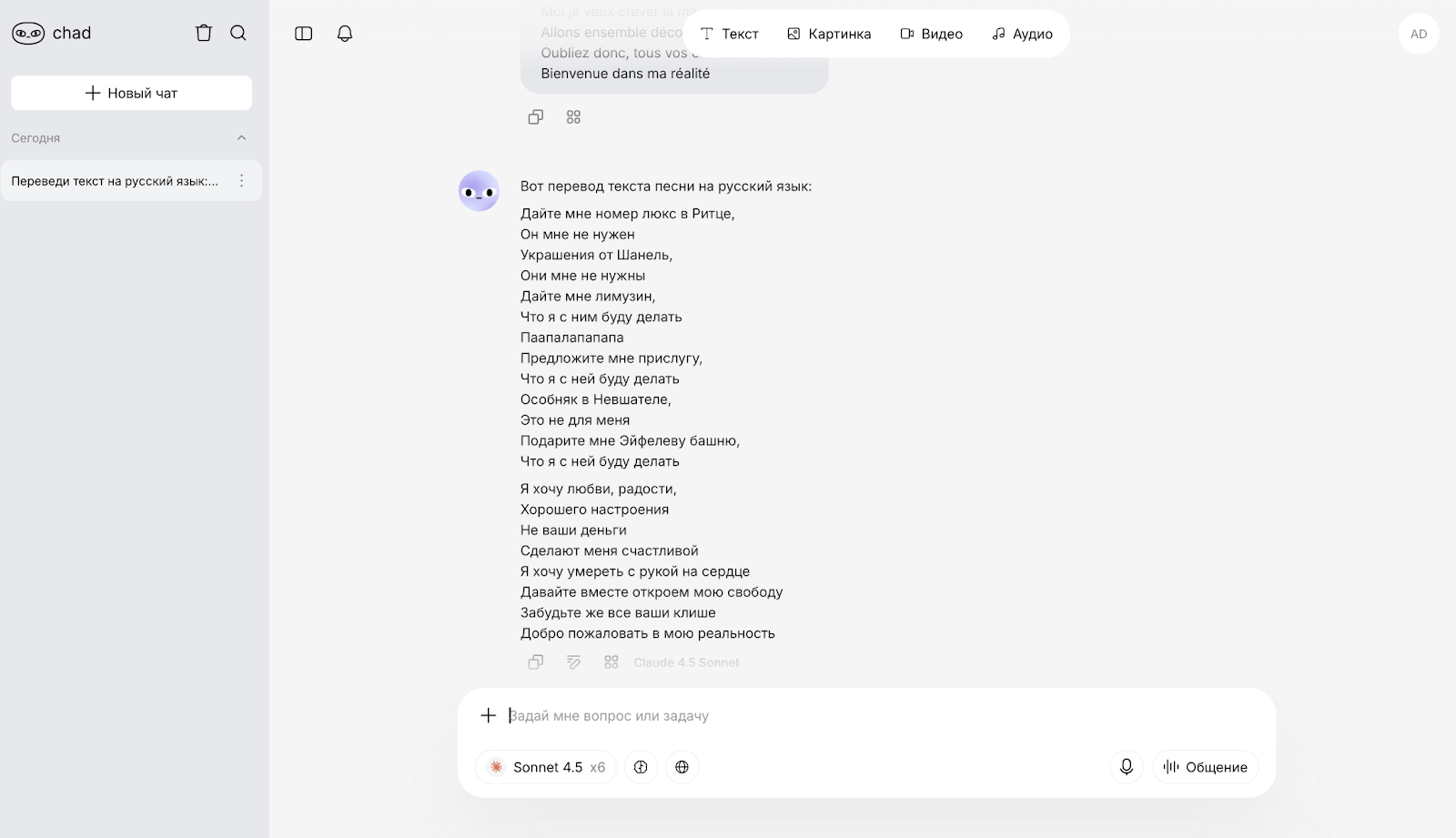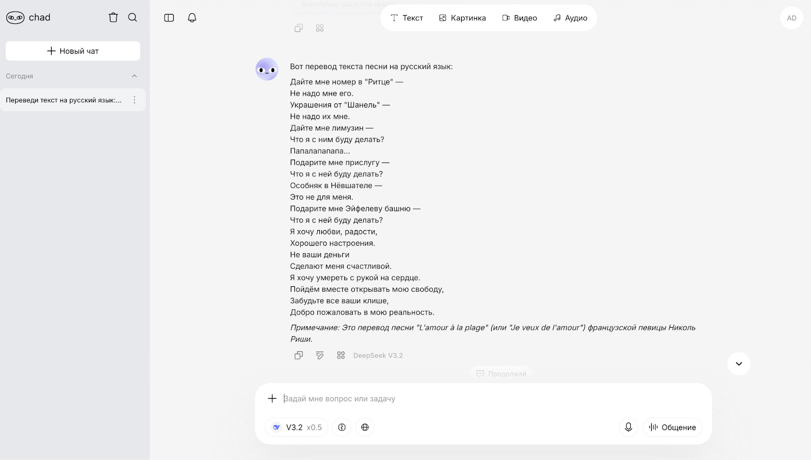 Перевод похож на результаты предыдущих моделей, глобальных недостатков в тексте нет. Но есть сомнительный комментарий нейросети по поводу названия песни и исполнителя. Указанное название относится к песне группы Niagara, а Николь Риши вообще не существует. Возможно, подразумевалась американская певица Николь Ричи, но она не француженка и не имеет отношения к тексту песни.