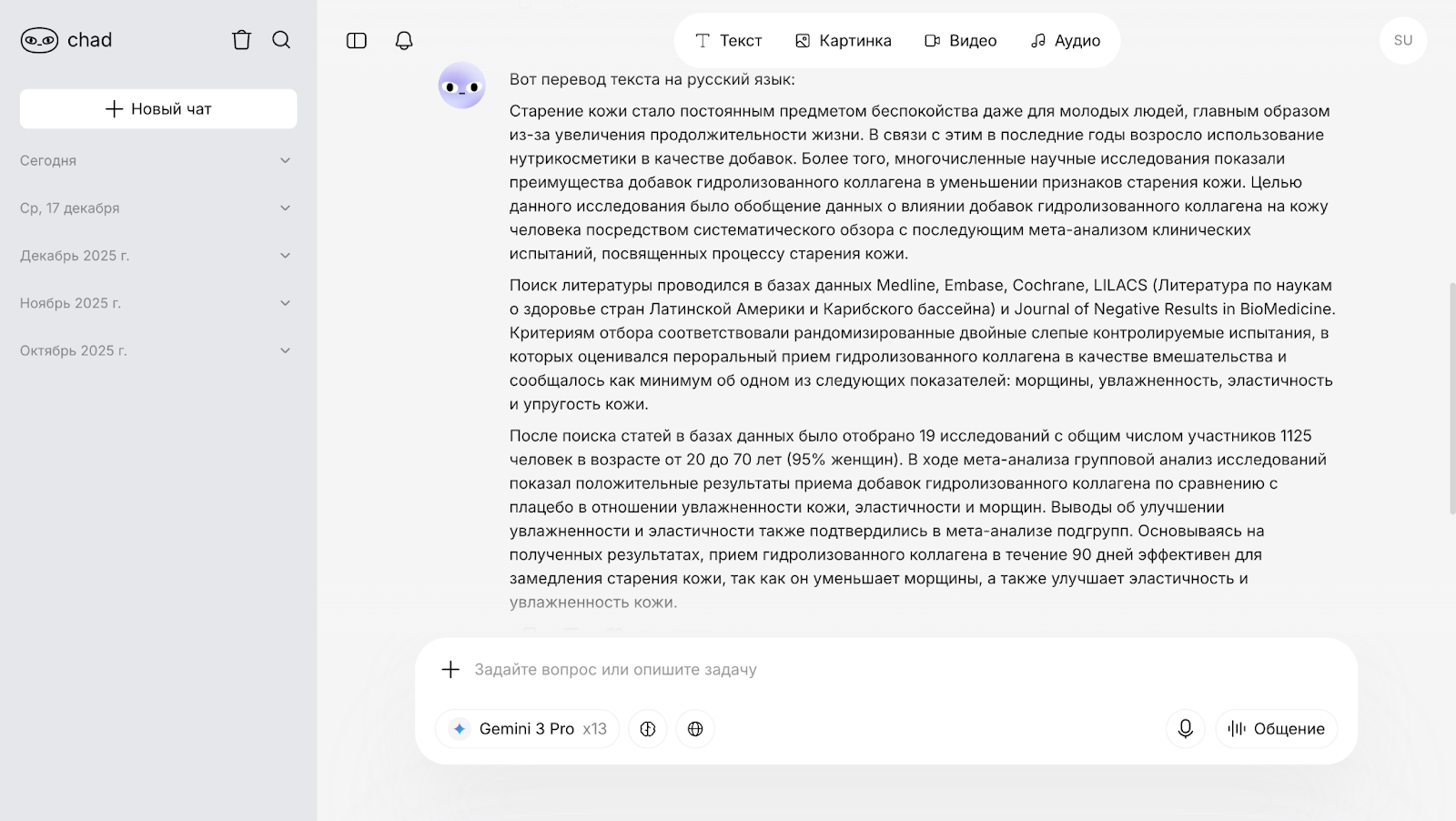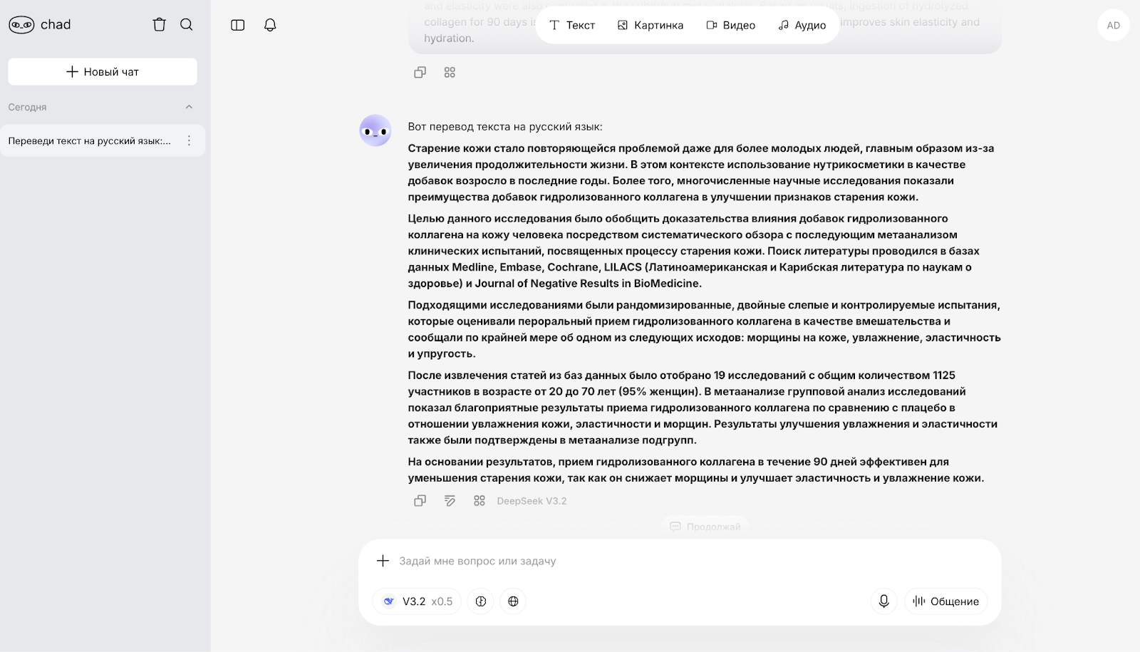 У переводчика возникают те же проблемы, что и у большинства остальных моделей. Например, снова видно «улучшение признаков старения». Зато дальше появляется научная формулировка «улучшение гидрации». Ранее сервисы употребляли словосочетание «улучшение увлажнения». Кажется, термин больше подходит к стилю текста, однако написание не совсем корректное — на русском правильно говорить «улучшение гидратации».