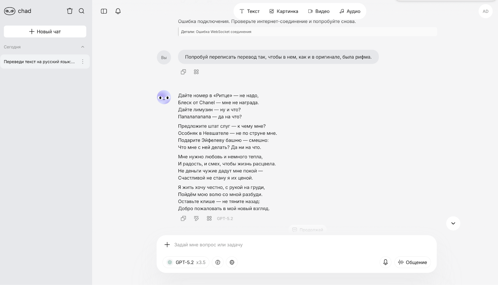 Модель GPT-5.2 успешно справилась с передачей смысла. Логика текста не нарушена, но, как и в первом случае, нейросеть не приводит этот текстовый блок к первичной рифмованной форме.