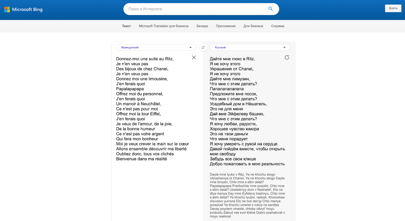 Здесь модель тоже справилась неидеально. Например, вместо перевода слова «personnel» как «персонал, прислуга», сервис выдал вариант «посох», который совсем не вписывается в контекст. Также певица поет о том, что ей хочется быть в хорошем настроении, а сервис предполагает, что ей хочется «хорошее чувство юмора».
