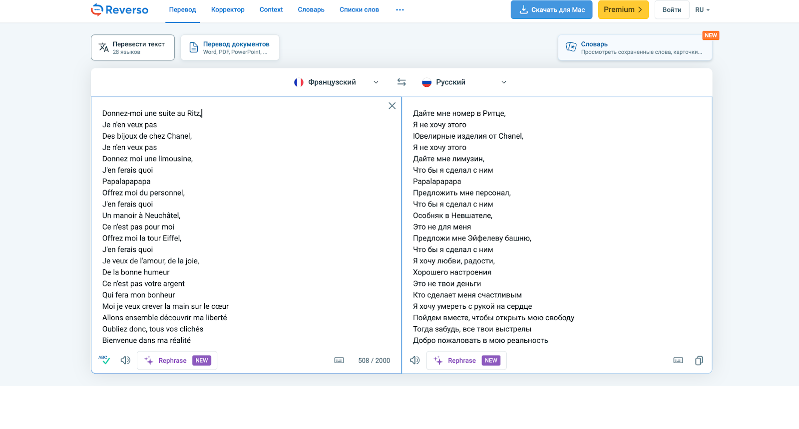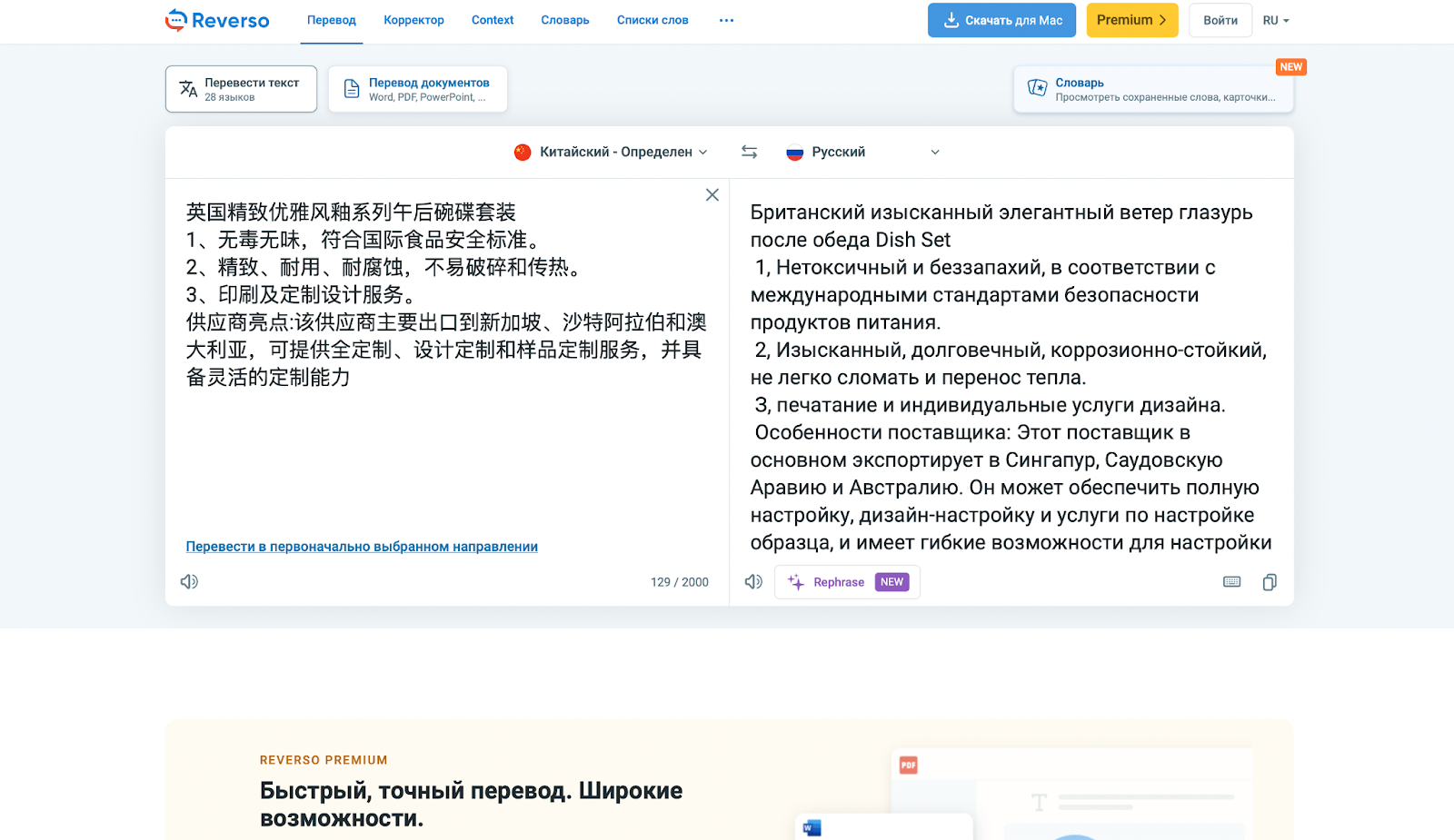 В обзорах утверждают, что китайская нейросеть особенно сильна в азиатских языках (логично). Она выдает точный перевод терминов, работает быстро и предлагает достойный функционал в бесплатной версии.
