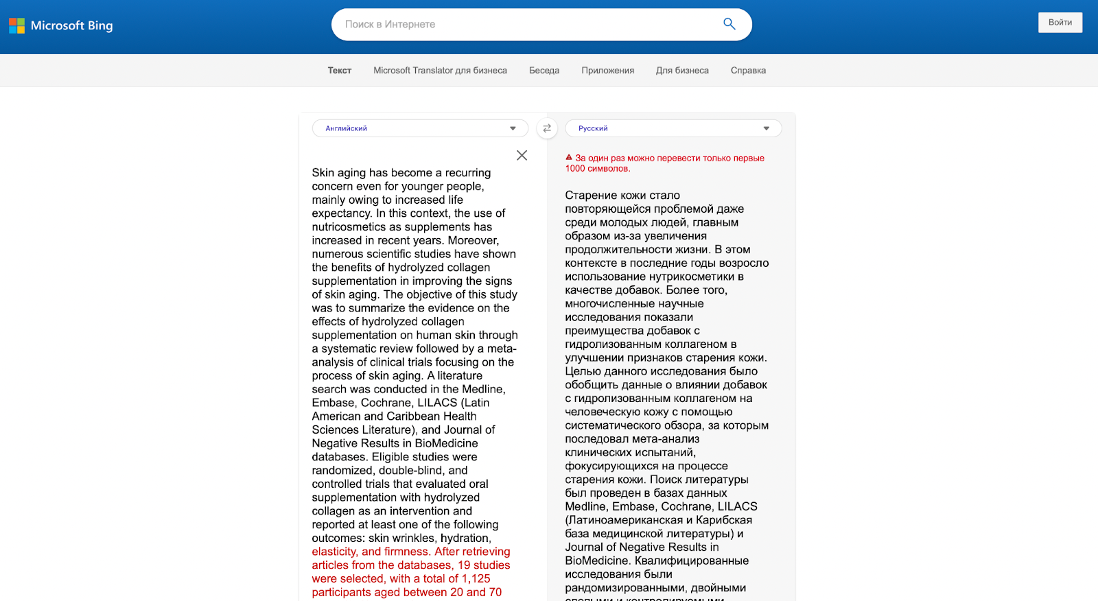 Еще до оценки перевода пользователь сталкивается с неприятной проблемой — ограничением знаков до 1 000. Перевести большой текст будет проблематично, нужно разбивать его на кусочки.