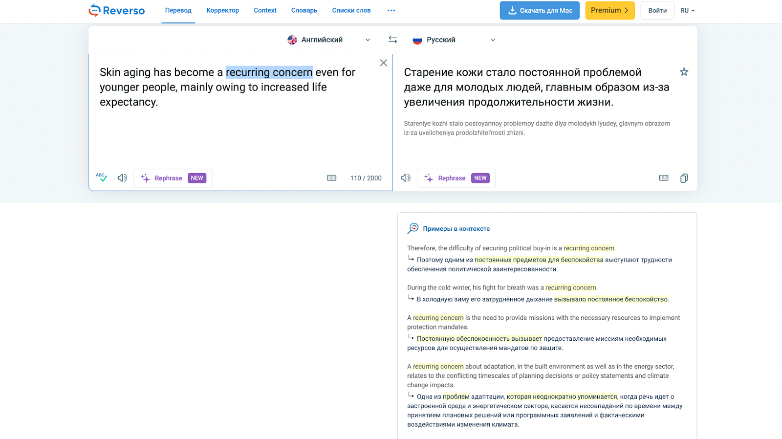 Стоит отметить, что функция «контекста», которая помогает упростить процесс перевода конкретных фраз, работает неплохо. В нашем случае Reservo предложил четыре варианта употребления словосочетания, последний из которых близок к правде.