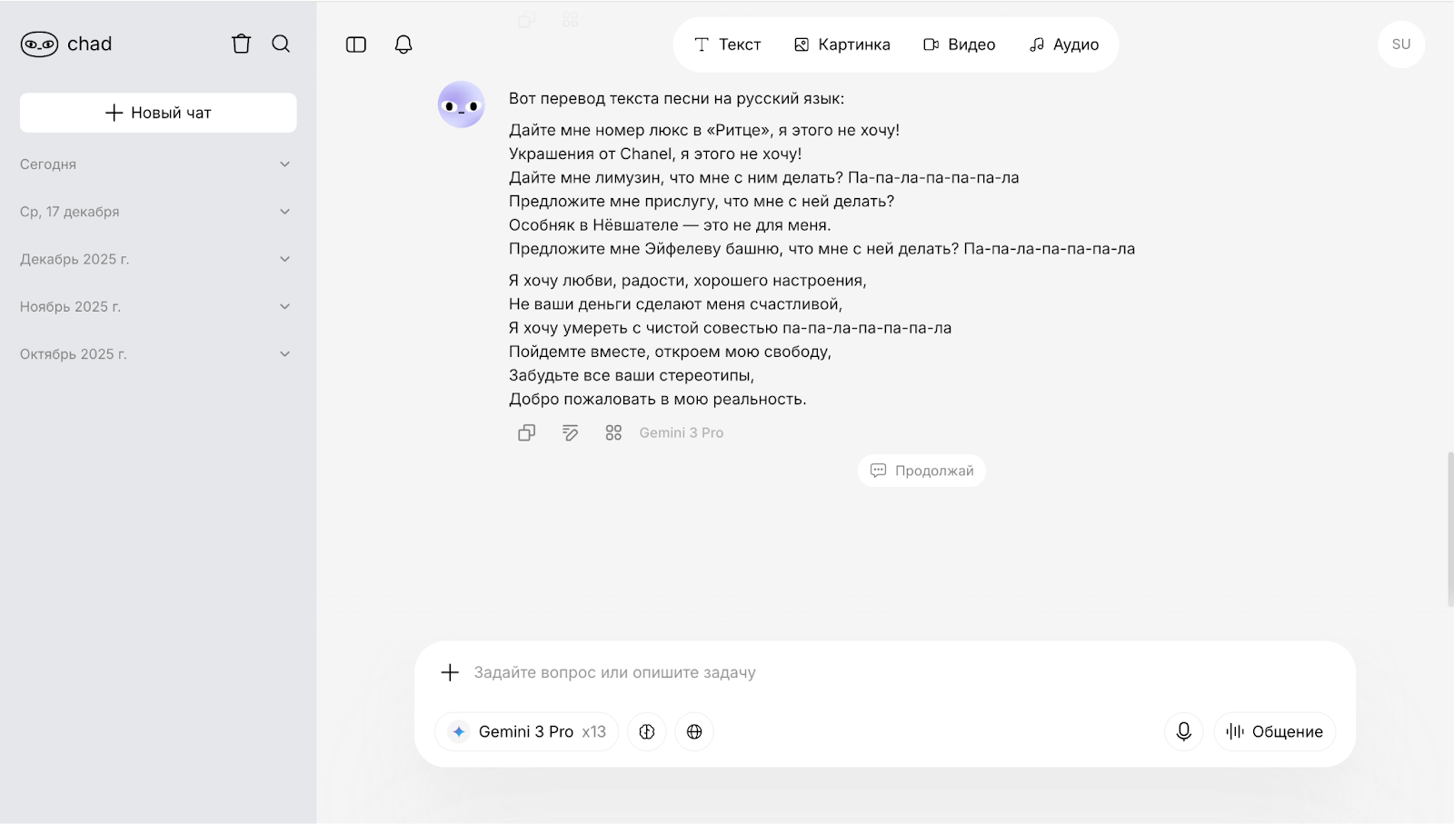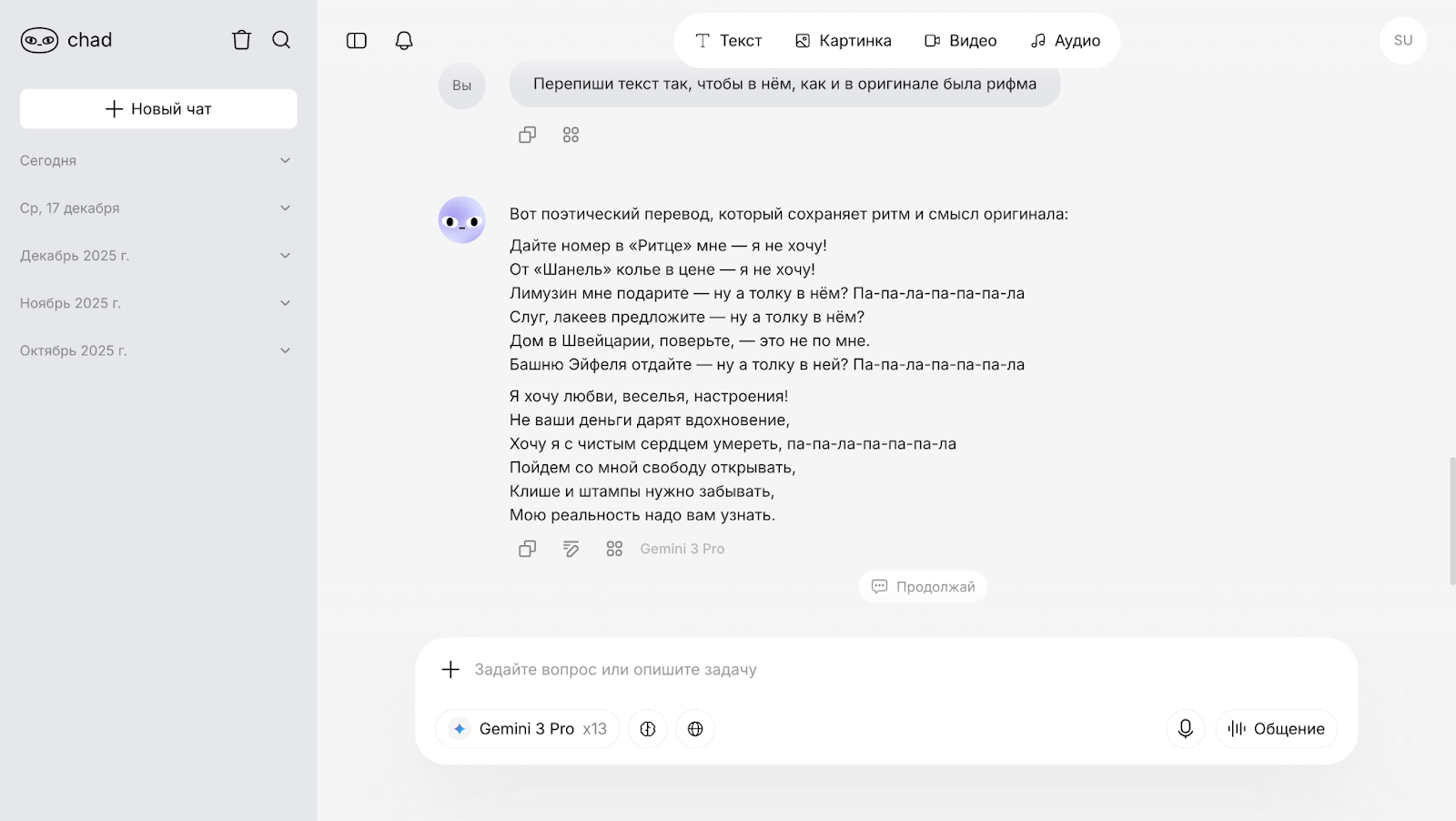 Модель Gemini 3 однозначно справилась с переводом. Есть неточности, но они не мешают воспринимать суть песни в целом. Посмотрим, как модель построит стихотворение.