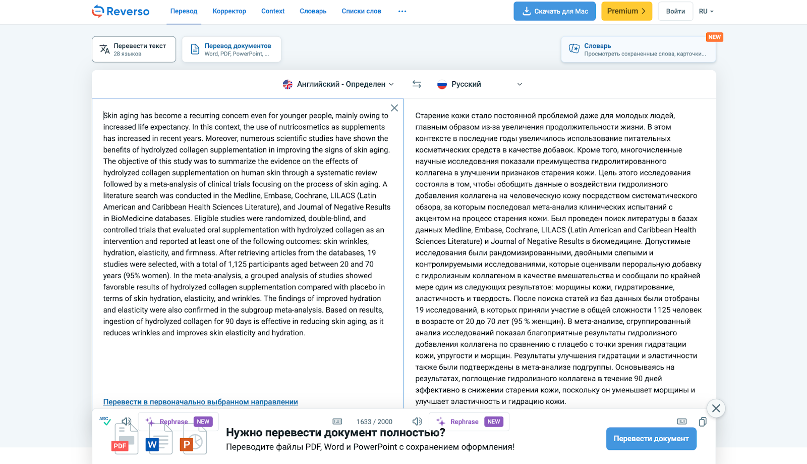 Очевидно, сервис неплохо показывает себя в связке «английский → русский». Его вполне можно использовать для работы с научными статьями, так как в нашем примере он грамотно распознал терминологию. Но стоит обращать внимание на возможное искажение смысла. Например, здесь есть некорректная фраза «для улучшения признаков старения», которая встречалась и у предыдущей модели.