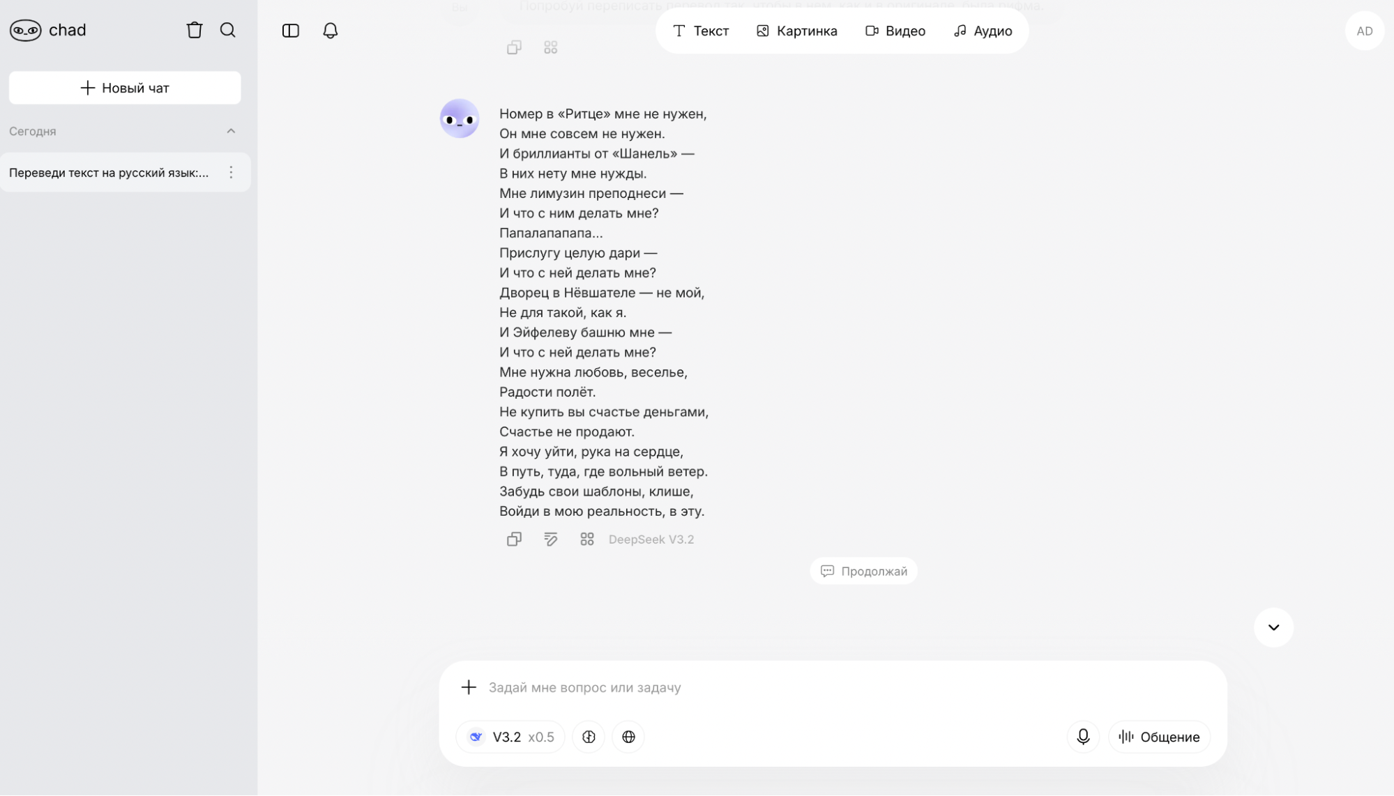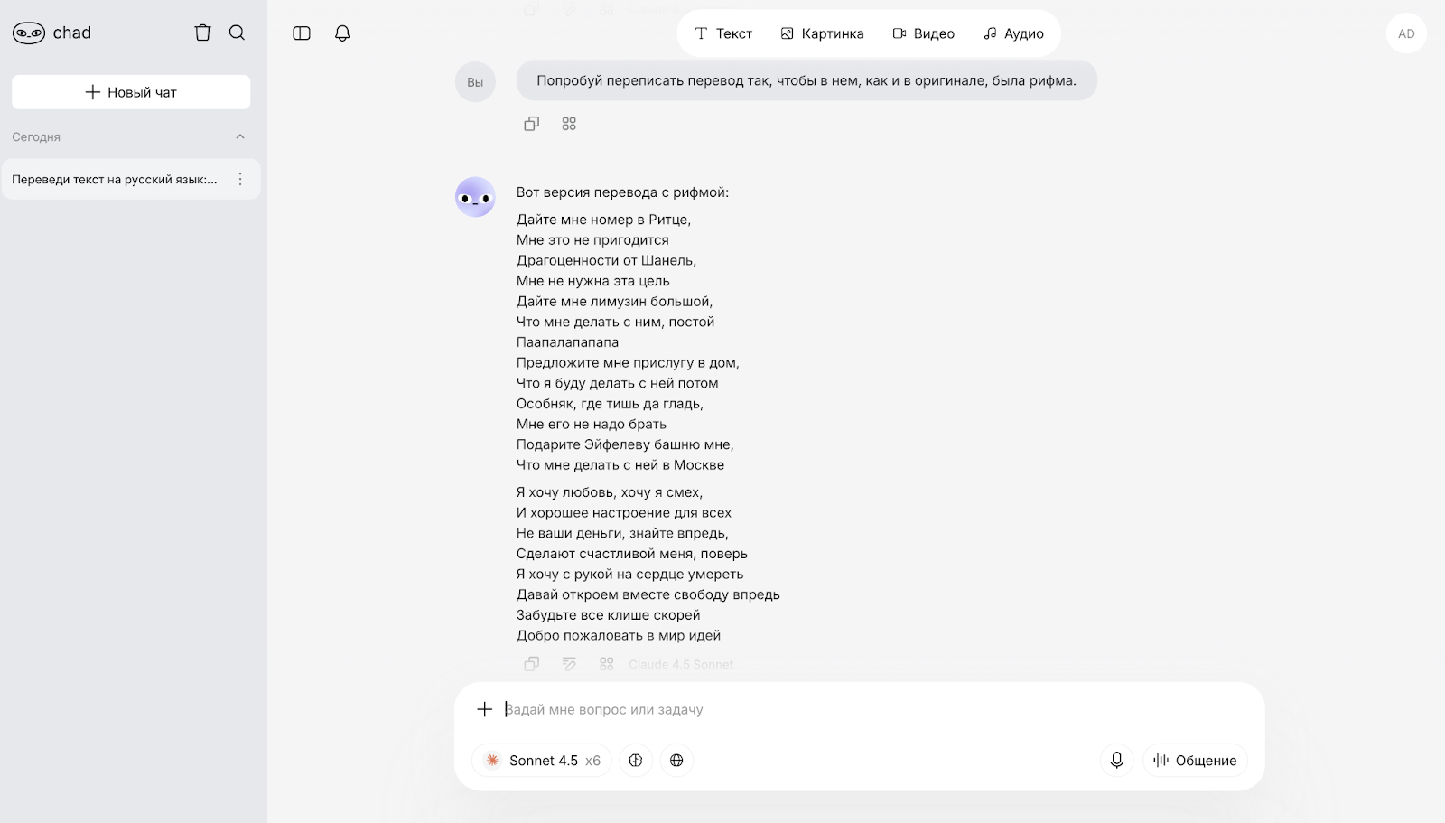 Модель не только сохранила смысл, но и доработала перевод песни так, чтобы получилась стихотворная форма.