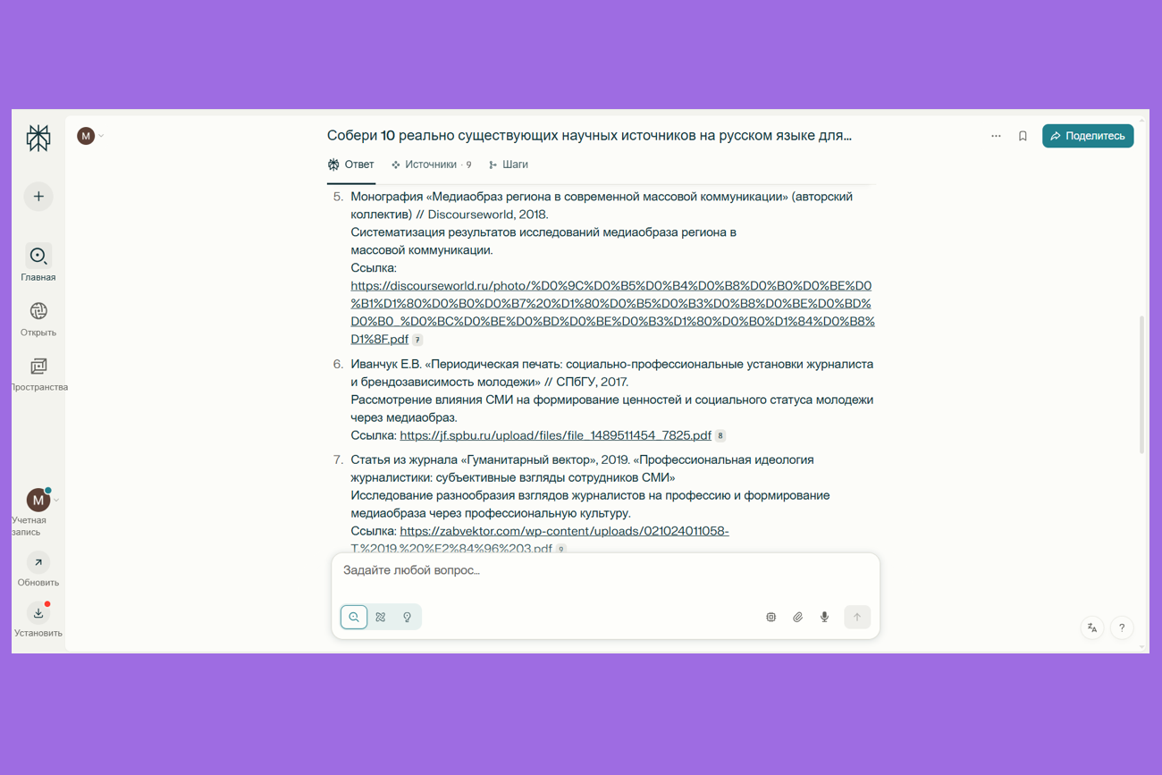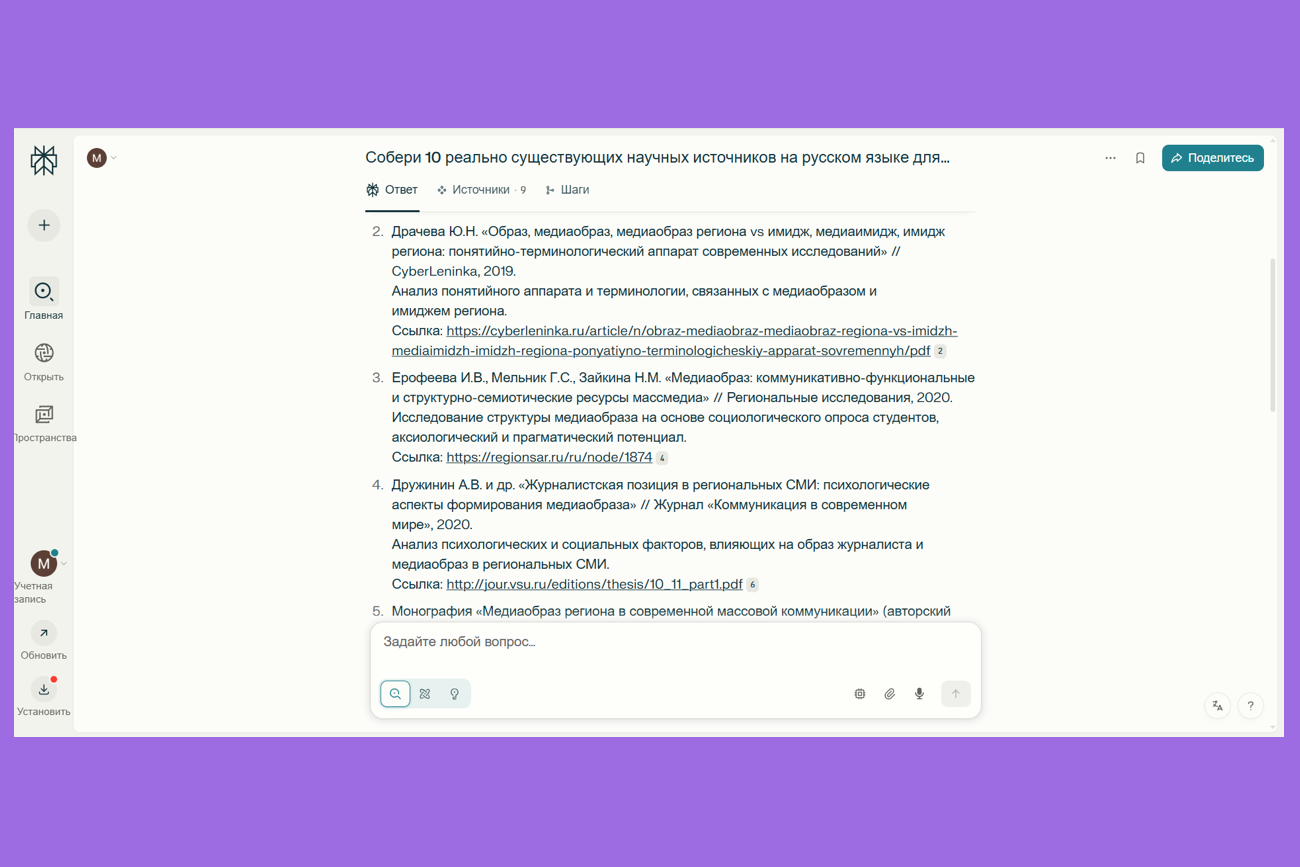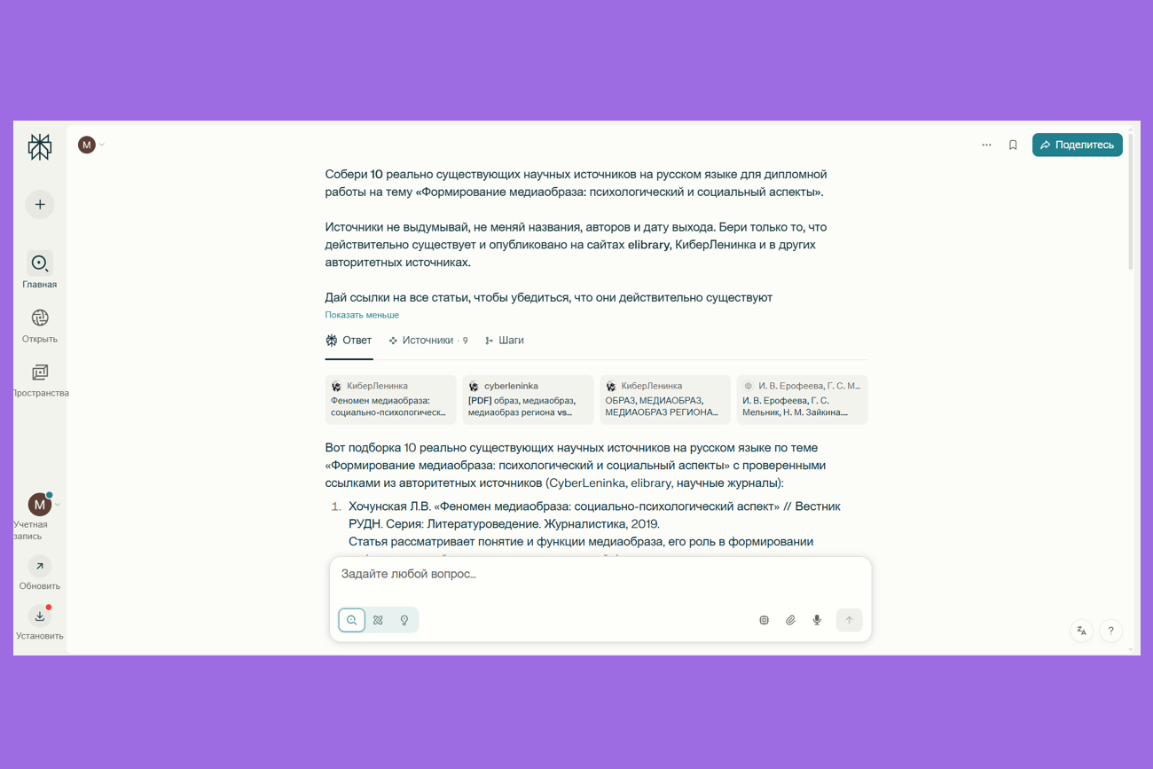 Минусы: не всегда находит русские источники, для корректной работы нужны точные запросы. Как и все нейросети, несмотря на подробный промпт, может выдумать источник, перепутать название или дату.