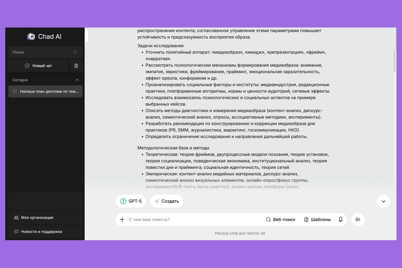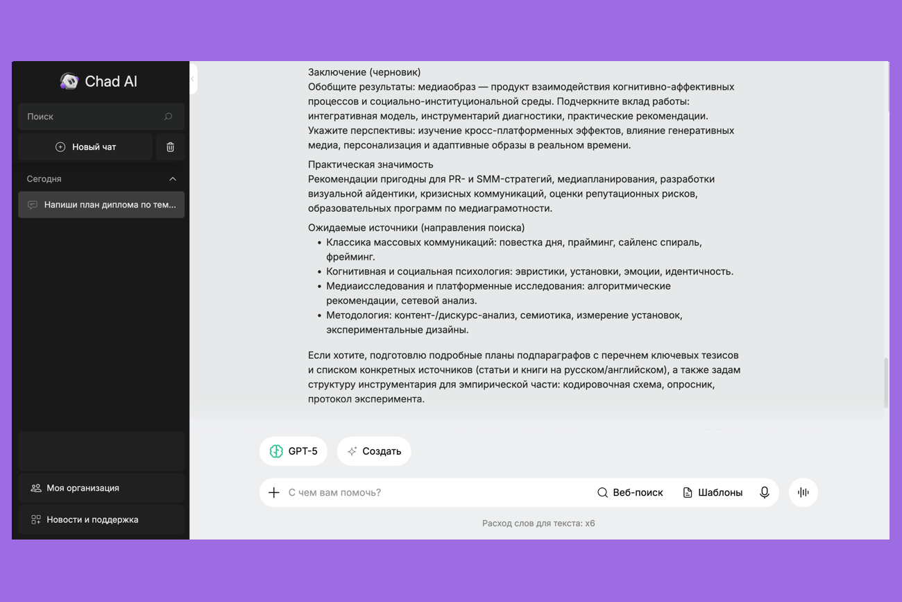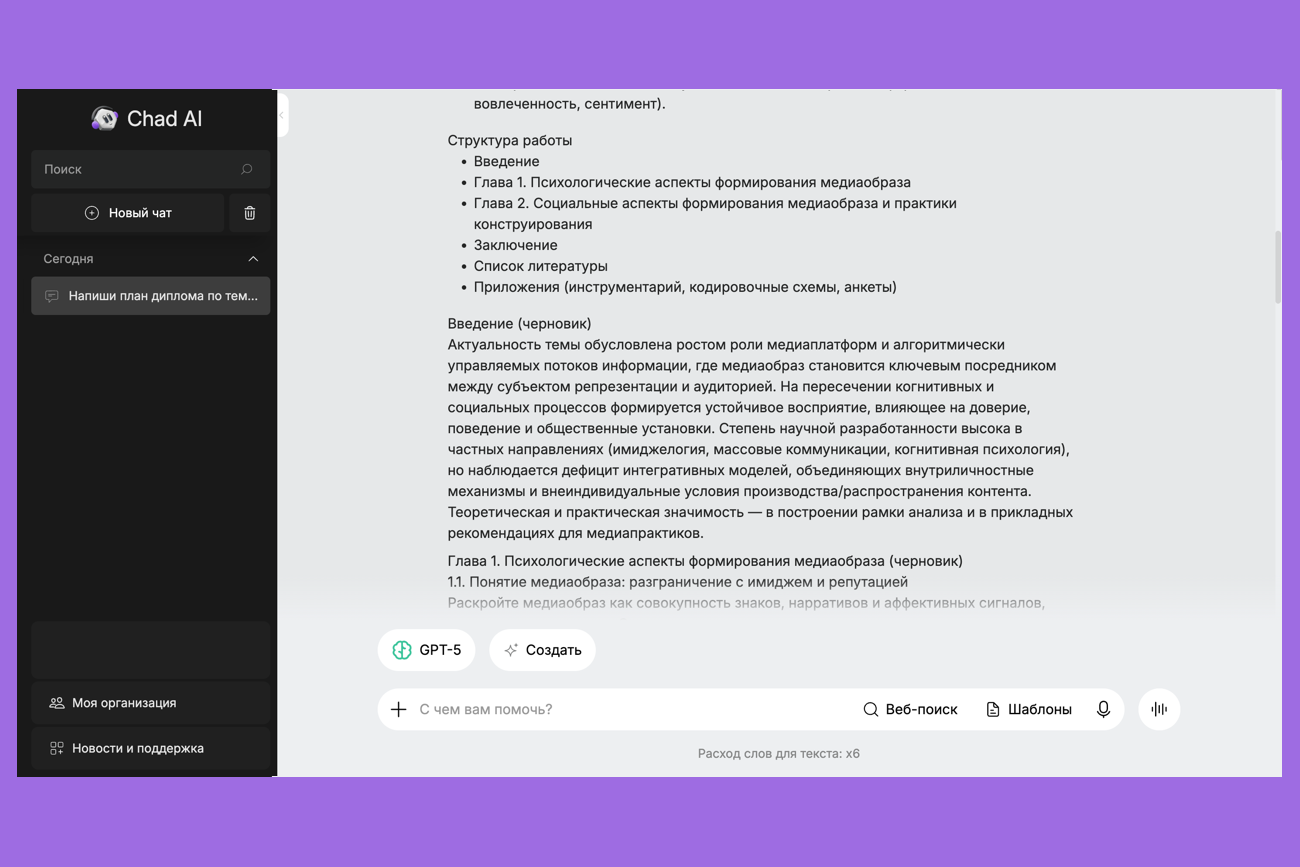 Что умеет: предлагает план диплома, генерирует черновики глав, формулирует цели и задачи, помогает переписать текст на научный язык.