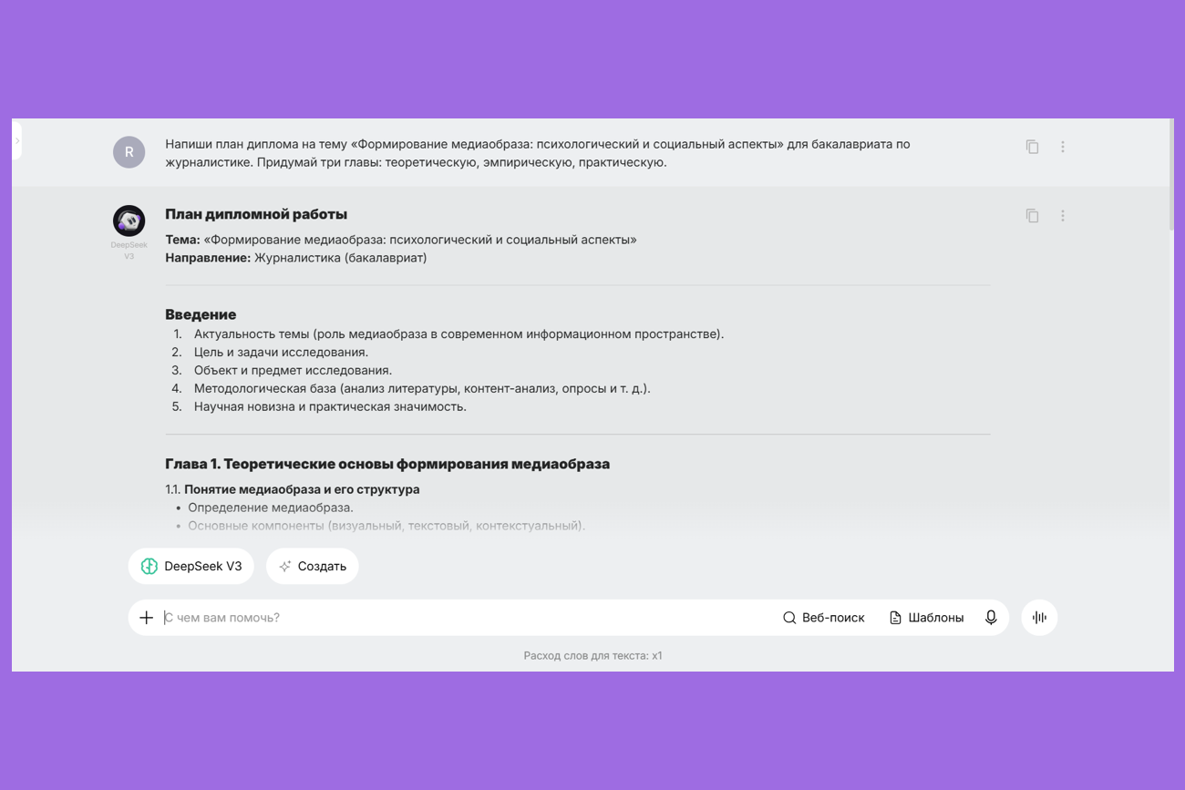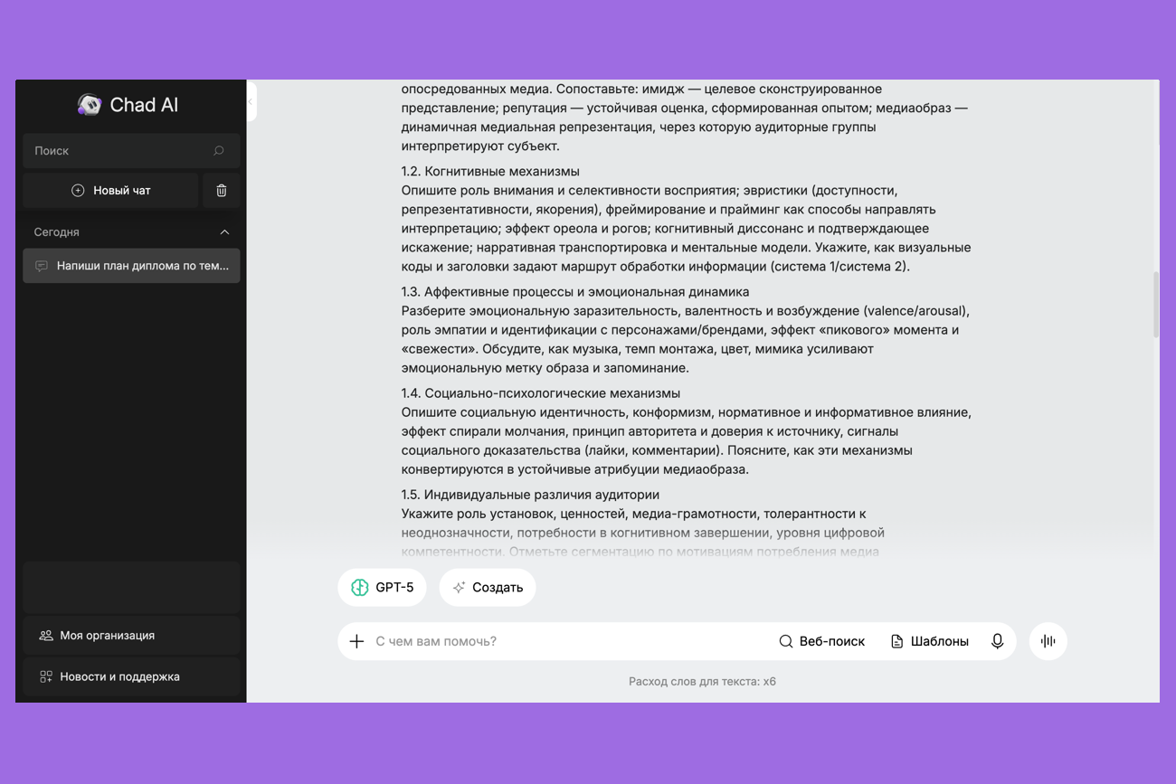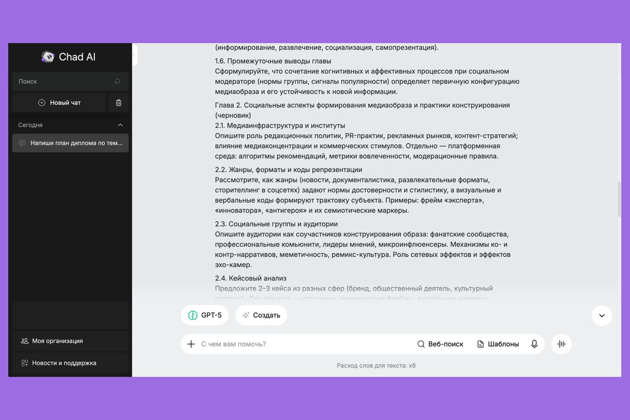 Что умеет: предлагает план диплома, генерирует черновики глав, формулирует цели и задачи, помогает переписать текст на научный язык.