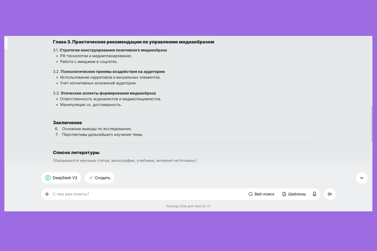 На старте удобно поручить нейросети подготовку структуры ВКР. ИИ создаст основу для дальнейшей работы: поможет разбить тему на главы и подтемы с учётом научного стиля и логики.