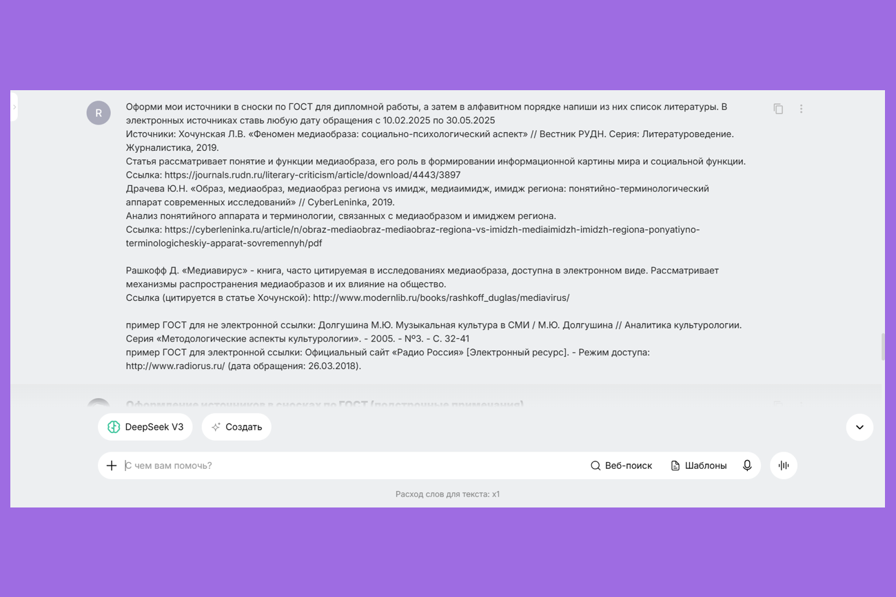 - Простое форматирование и проверка. Нейросети умеют оформлять текст согласно ГОСТу.