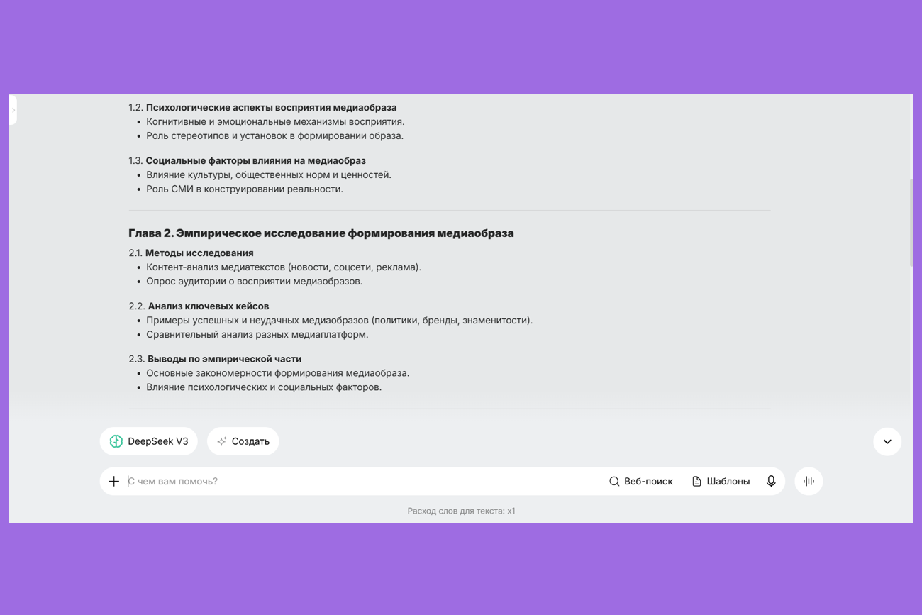 Совет: уточните тип работы (эмпирическое исследование или теоретический обзор), а нейросеть подстроит план под формат.