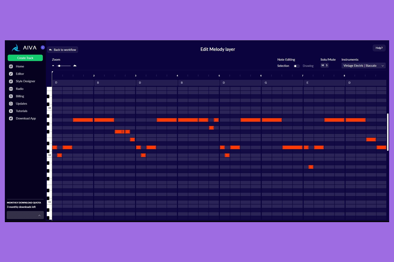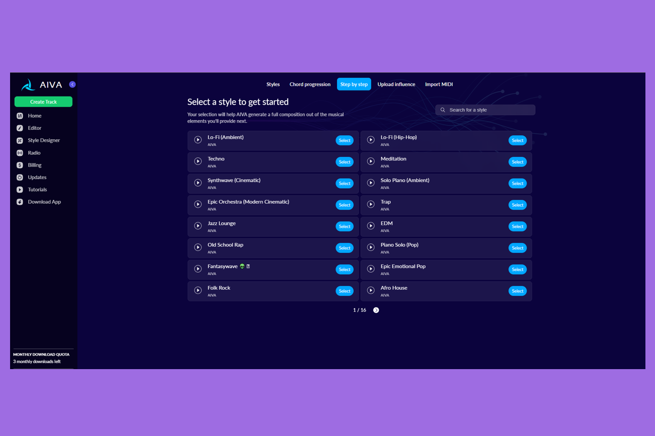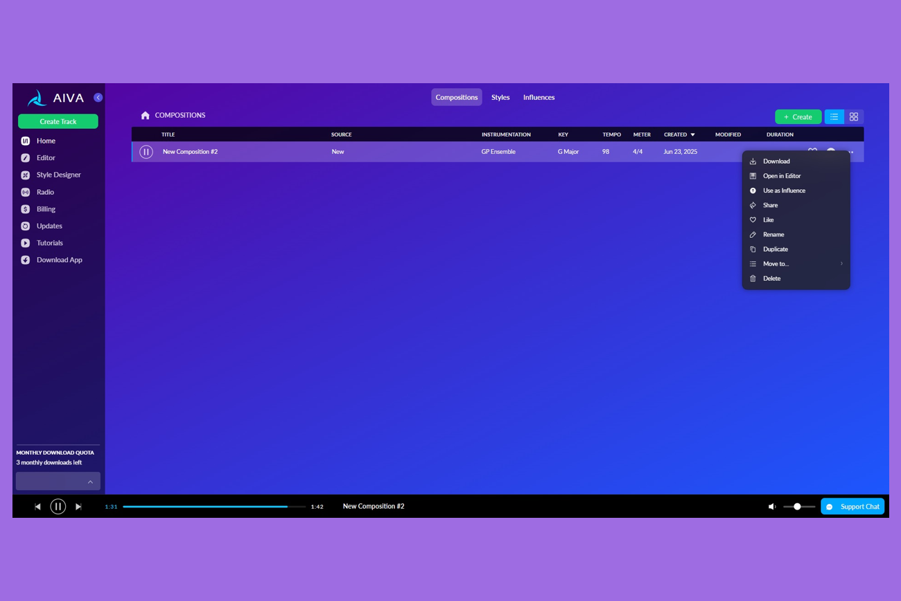 Для аккаунтов со стандартным тарифом доступно до 15 загрузок в месяц. Авторские права остаются у AIVA, но сервис не нужно указывать в списке создателей, есть ограниченная монетизация.