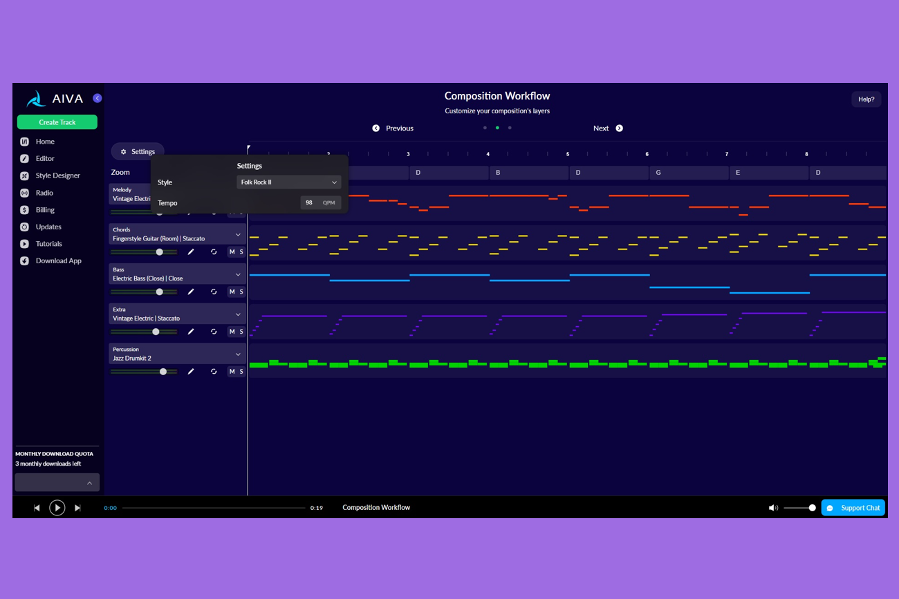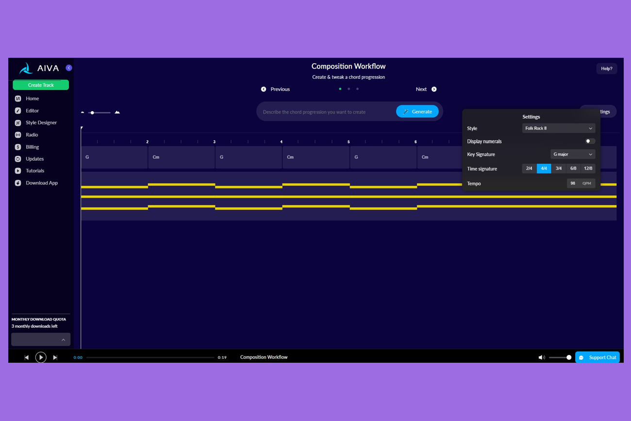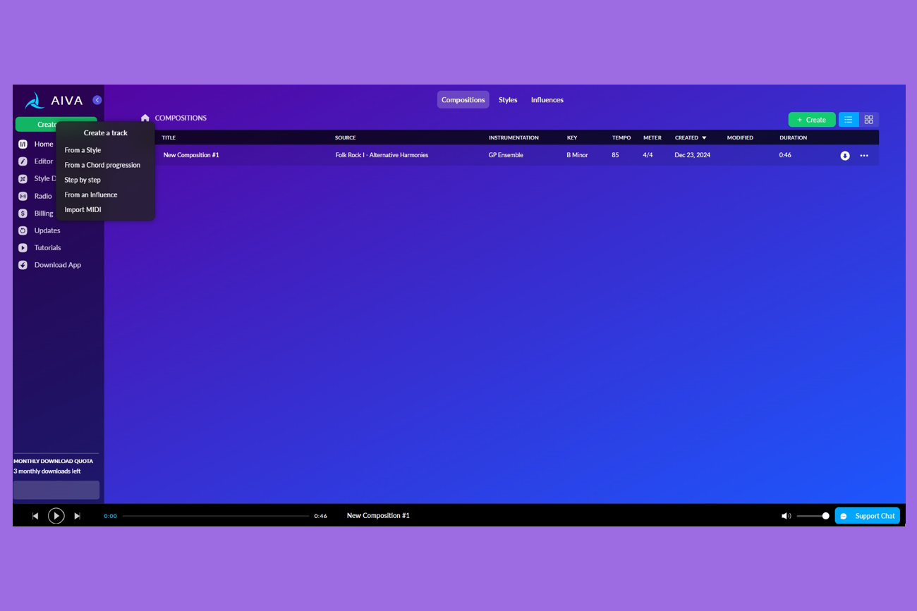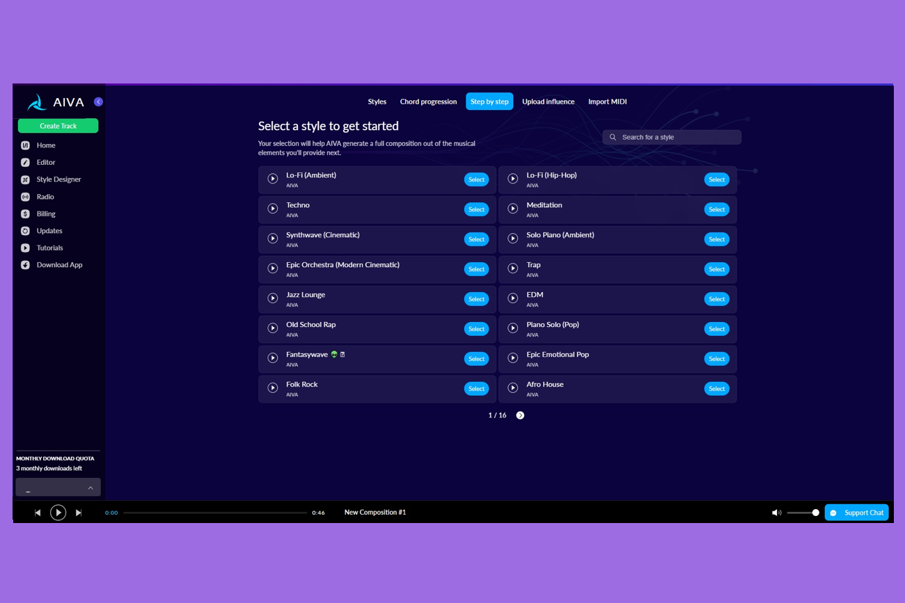 Для аккаунтов со стандартным тарифом доступно до 15 загрузок в месяц. Авторские права остаются у AIVA, но сервис не нужно указывать в списке создателей, есть ограниченная монетизация.