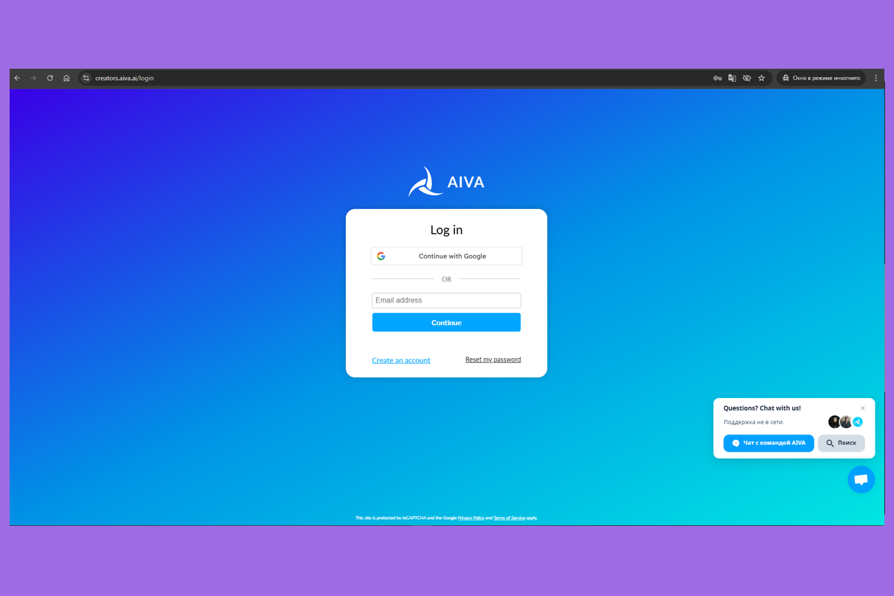 Попробуем создать трек без слов. Помощь в этом нам окажет нейросеть AIVA — она открывается без применения дополнительных расширений или манипуляций с сетью. А пока мы будем создавать музыку, можем послушать радио. Переходим на сайт и выбираем подходящий формат регистрации.