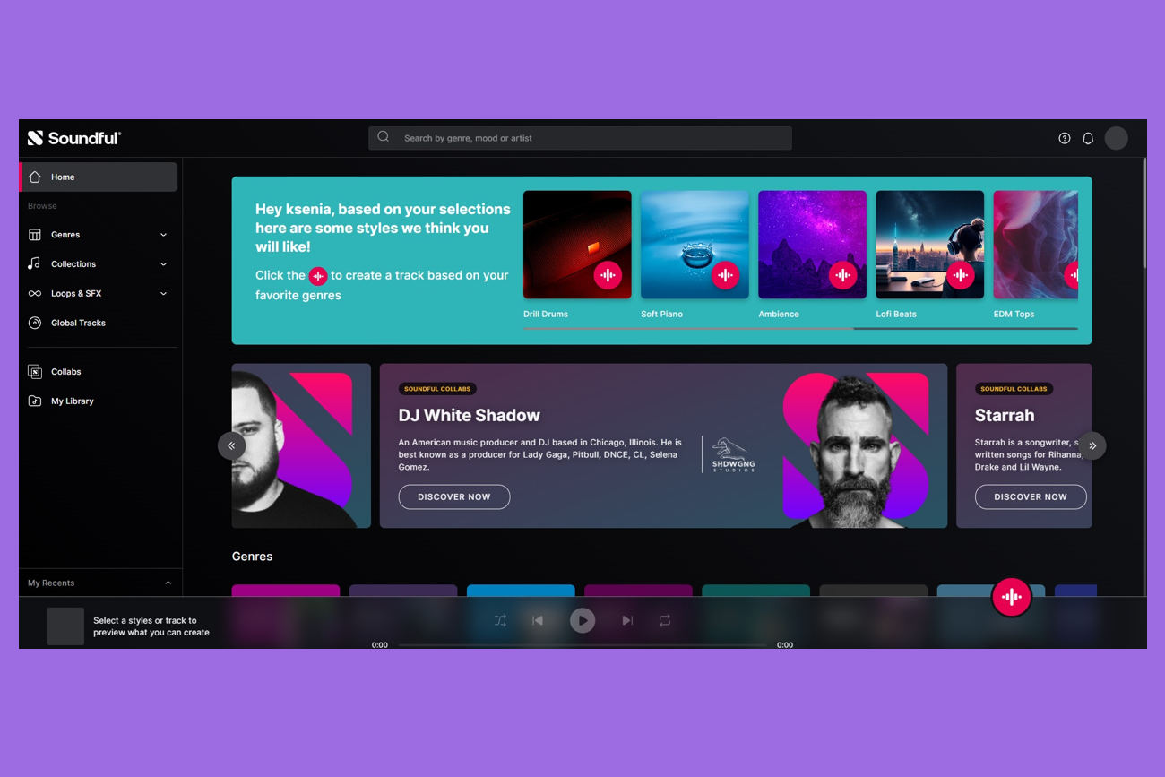 Что умеет: создаёт треки по нескольким сценариям: по стилю, аккордовой последовательности, из загружаемого файла или шаг за шагом. Пользователи могут слушать радио по стилям или пройти обучение по созданию треков.