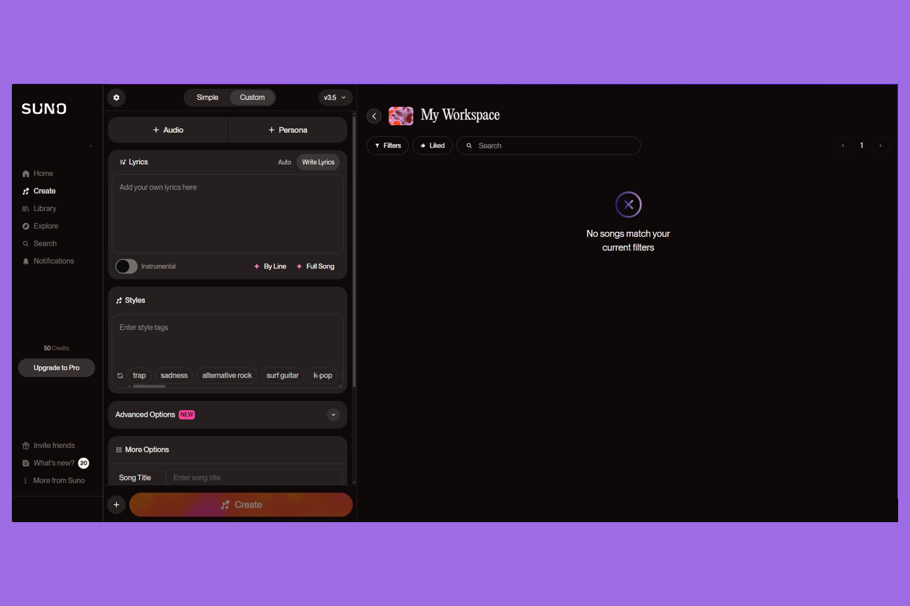 Для пользователей с тарифом PRO доступна последняя версия Suno — 4.5 с ранним доступом к новым функциям. Каждый месяц начисляются 2500 кредитов, которых хватит на создание примерно 500 песен. Расширенные функции и деление треков до 12 дорожек (вокал и инструменты). Загрузка аудио продолжительностью до 8 минут. Коммерческие права на созданные песни переходят к пользователям. Также есть приоритетная очередь создания и возможность покупать кредиты.