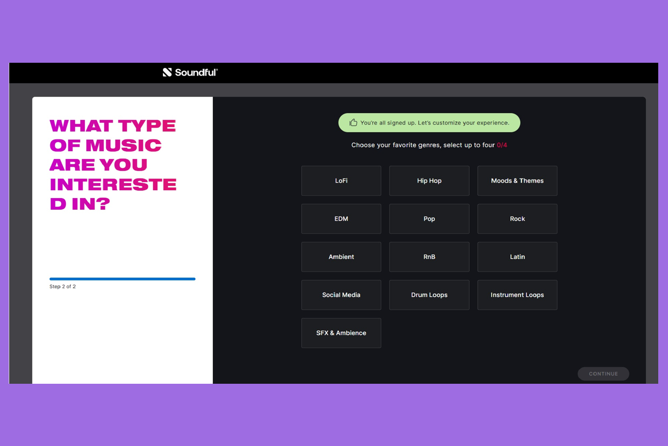 При регистрации пользователю предложат выбрать одну из ролей: продюсер, певец, рэпер, DJ, инфлюенсер, создатель контента для соцсетей или видео, бизнесмен. Можно указать предпочитаемые жанры.