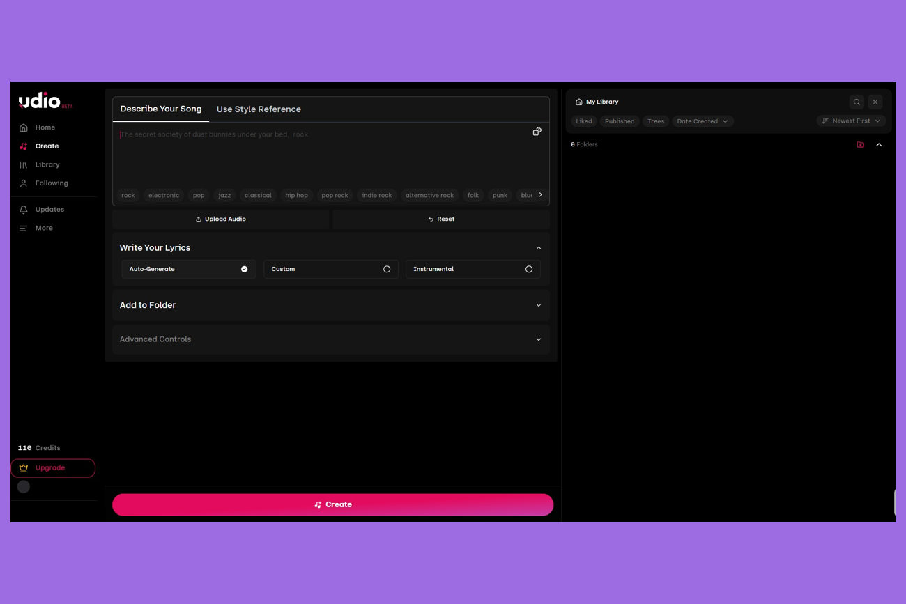 Что умеет: создаёт композиции под требования пользователя. Можно выбрать подходящие жанры, загрузить аудиофайл-референс, указать требования к тексту песни. Во вкладке с продвинутыми настройками (стоимость два кредита) удобно настраивать генерацию клипов, время включения текста, учёт требований промпта при создании трека и скорость обработки.