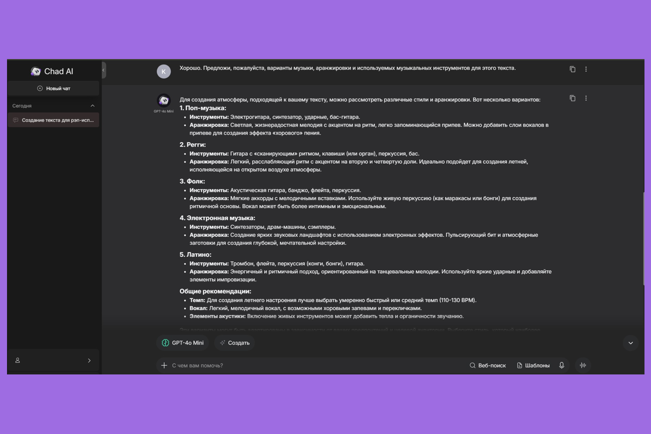 Теперь мы можем использовать полученный текст и идеи композиции для дальнейшей работы над треком. Например, использовать ИИ, чтобы написать мелодию и свести полноценную песню.