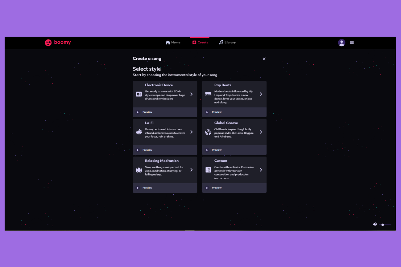 Что умеет: этот сервис силён в создании приятной фоновой музыки без слов. Создание треков производится по жанрам, можно выбрать скорость музыки, громкость и исполнение. В бесплатной версии нет ограничений по генерации треков. Доступно более 25 жанров и возможность загрузки одного файла в формате MP3 в месяц.