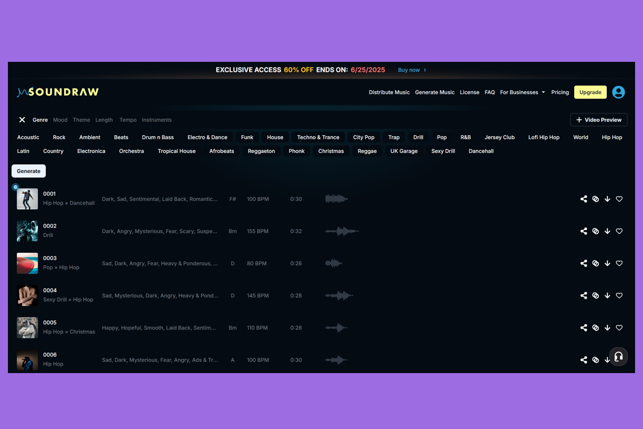 Что умеет: позволяет сгенерировать музыку более чем в 30 жанрах. Настройки позволяют выбрать одно из 20+ настроений, указать тему (например, влог или корпоратив) и длительность трека. Также есть настройки темпа и используемых музыкальных инструментов.