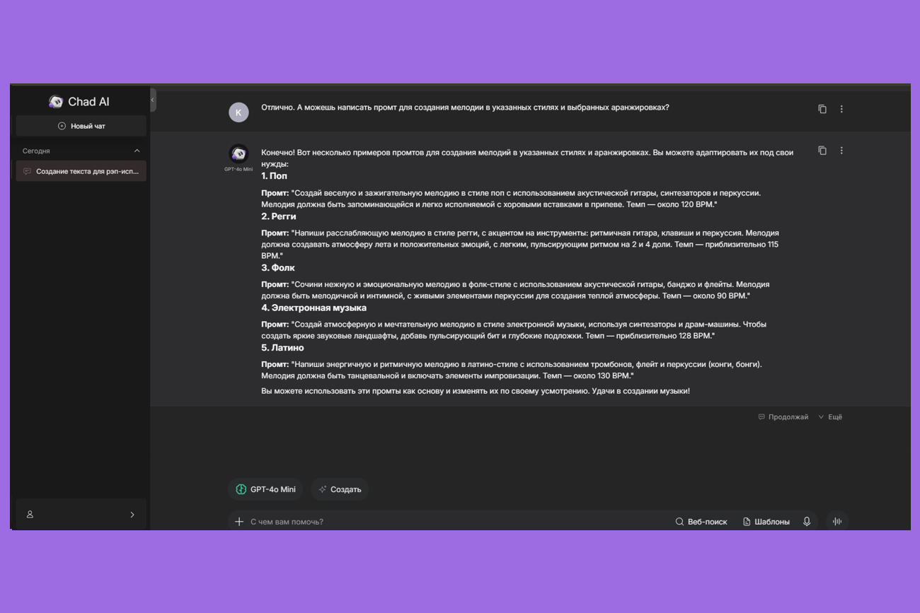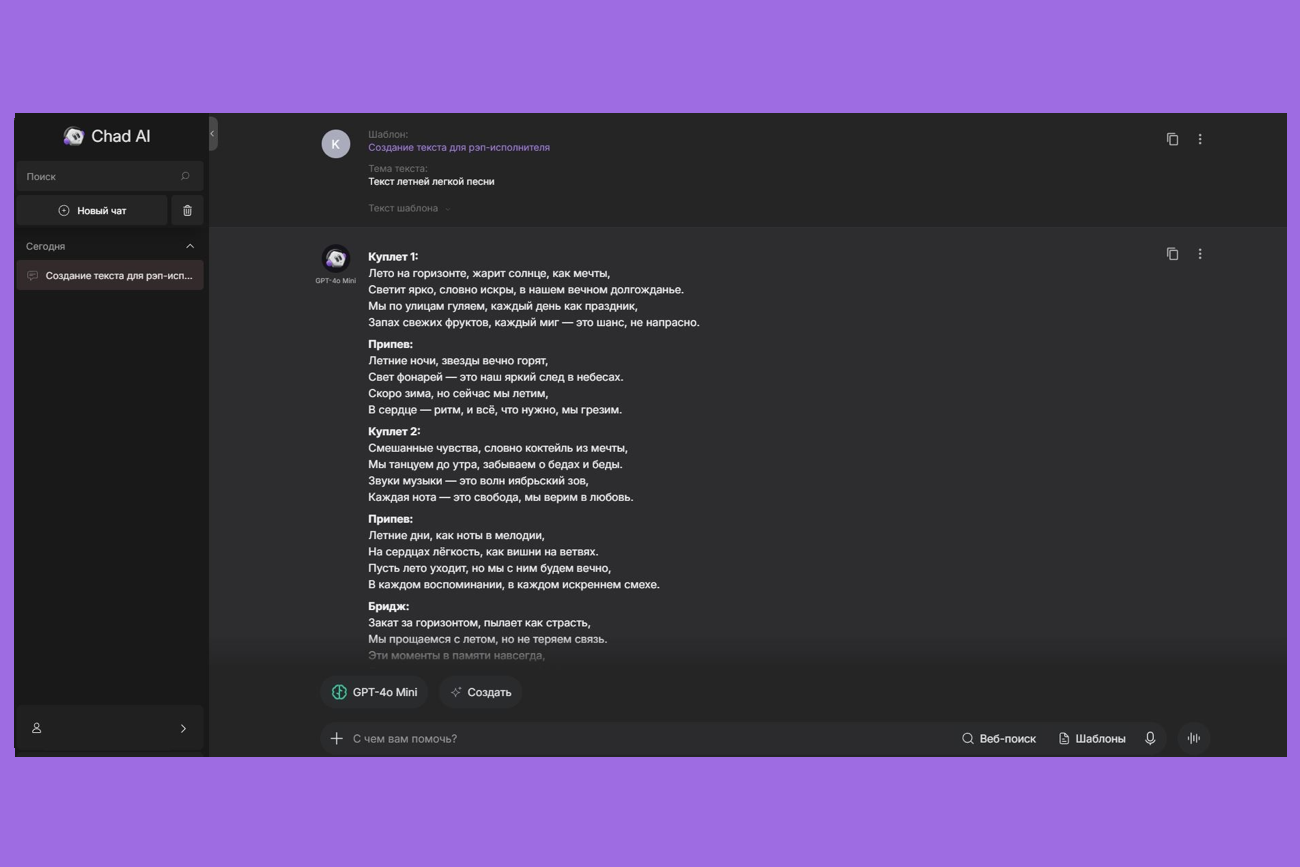 Доступ к возможностям популярных нейросетей можно получить через WebGPT. Сервис предоставляет широкий набор опций по генерации текста и может помочь в создании композиции. В бесплатной версии доступно семь запросов в день с моделями GPT-4o Mini и Claude 3 Haiku. Также можно использовать шаблоны промптов.