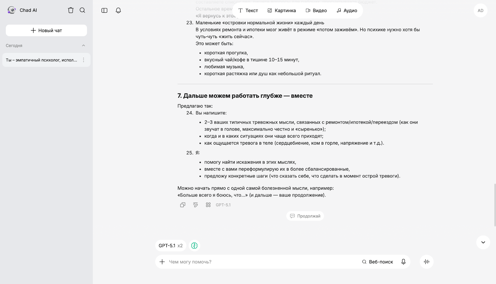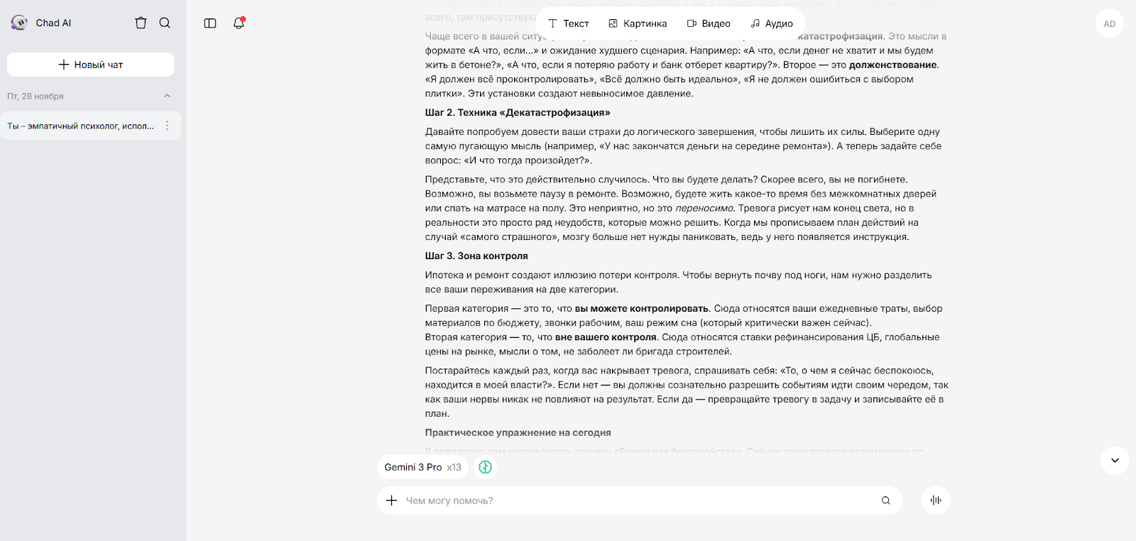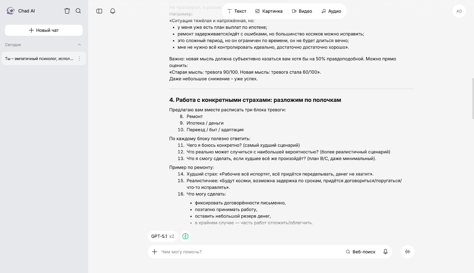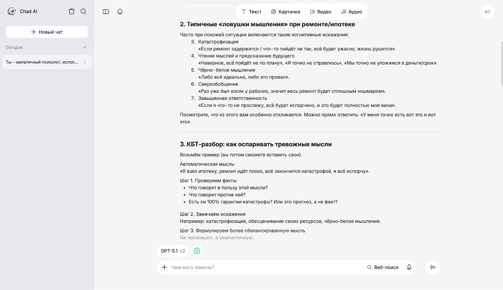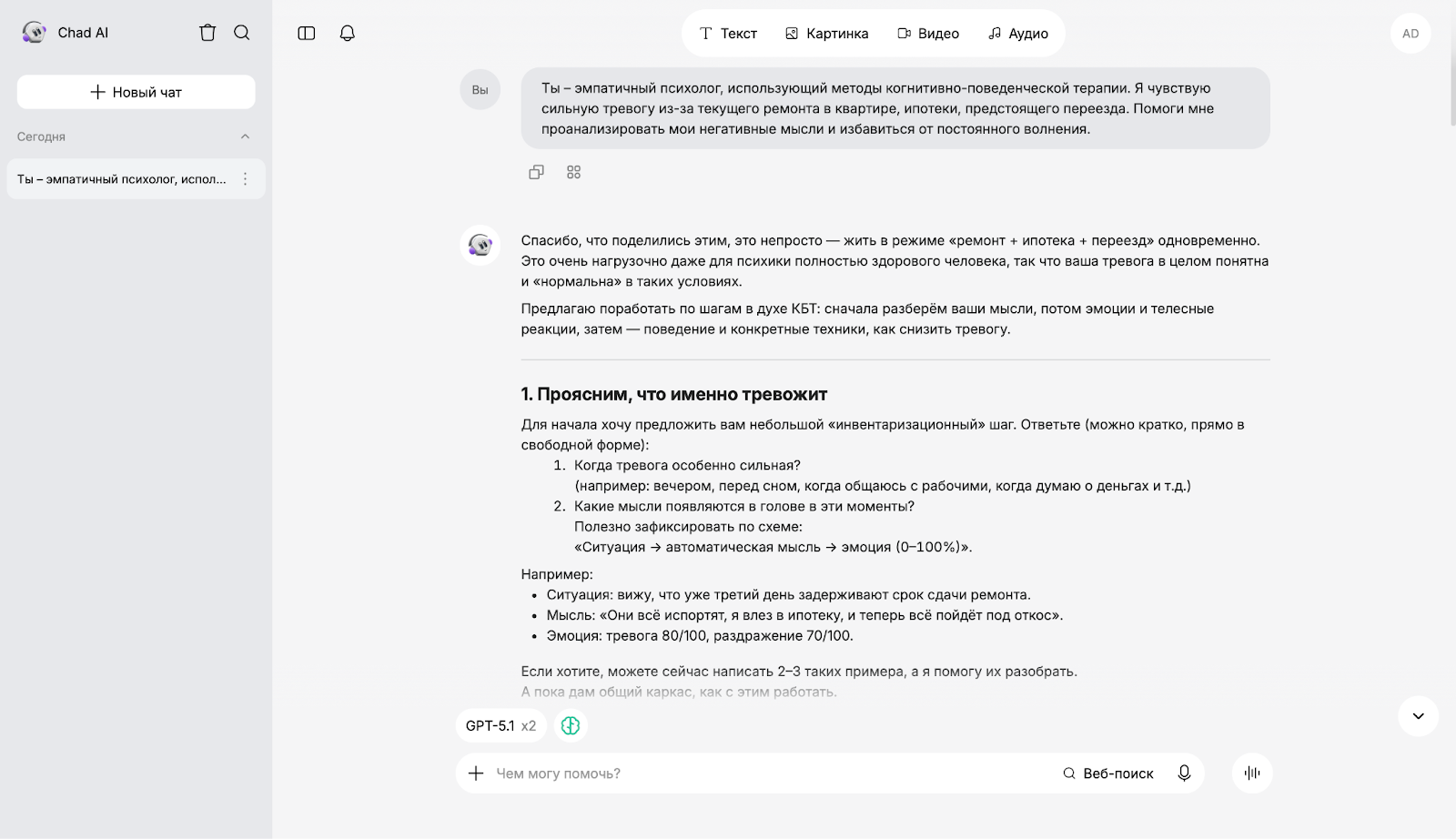 Чтобы оценить, как разные ИИ работают в роли психолога, мы использовали единый промпт: "Ты — эмпатичный психолог, использующий методы когнитивно-поведенческой терапии. Я чувствую сильную тревогу из-за текущего ремонта в квартире, ипотеки, предстоящего переезда. Помоги мне проанализировать мои негативные мысли и избавиться от постоянного волнения".