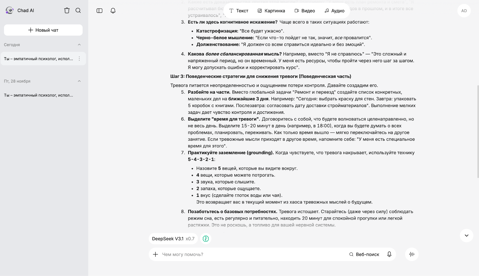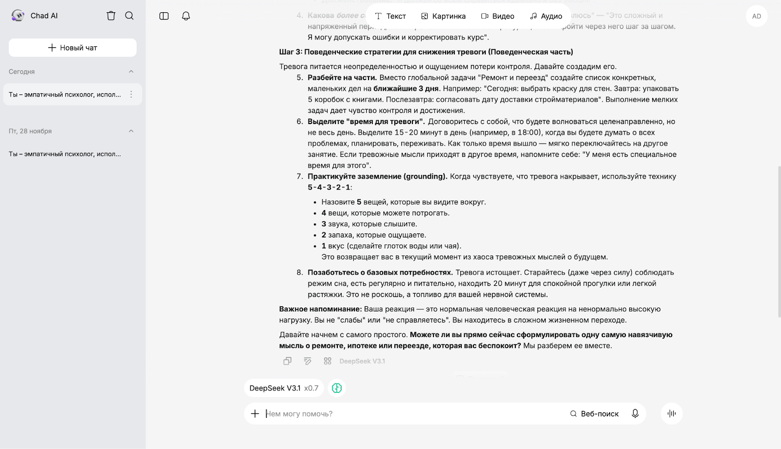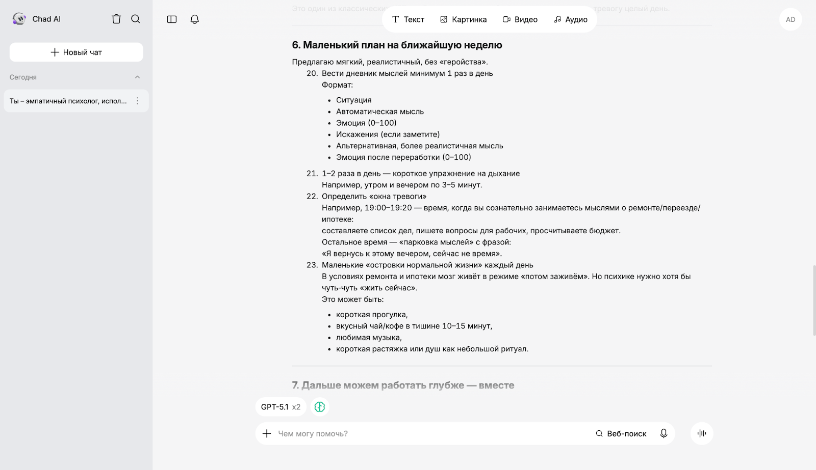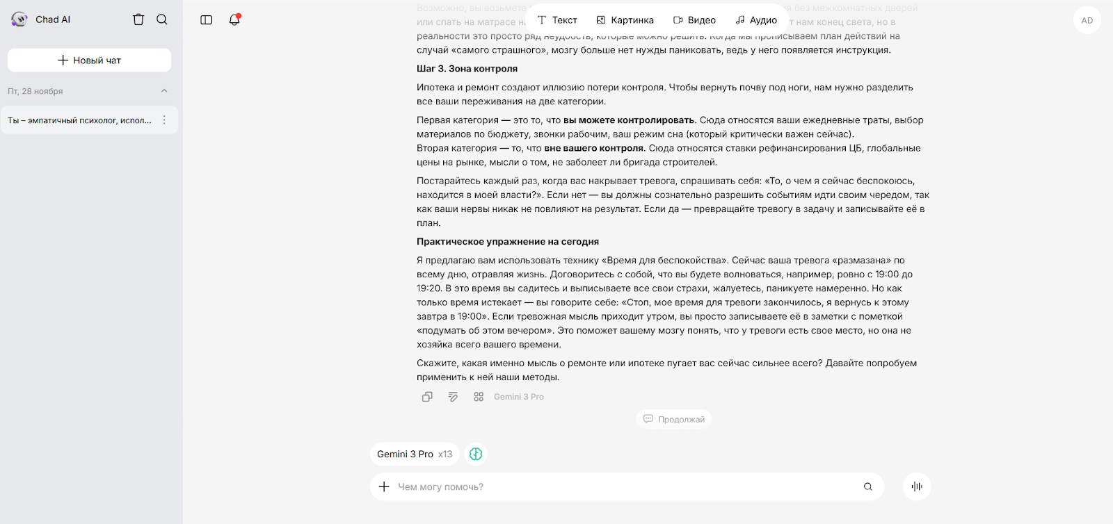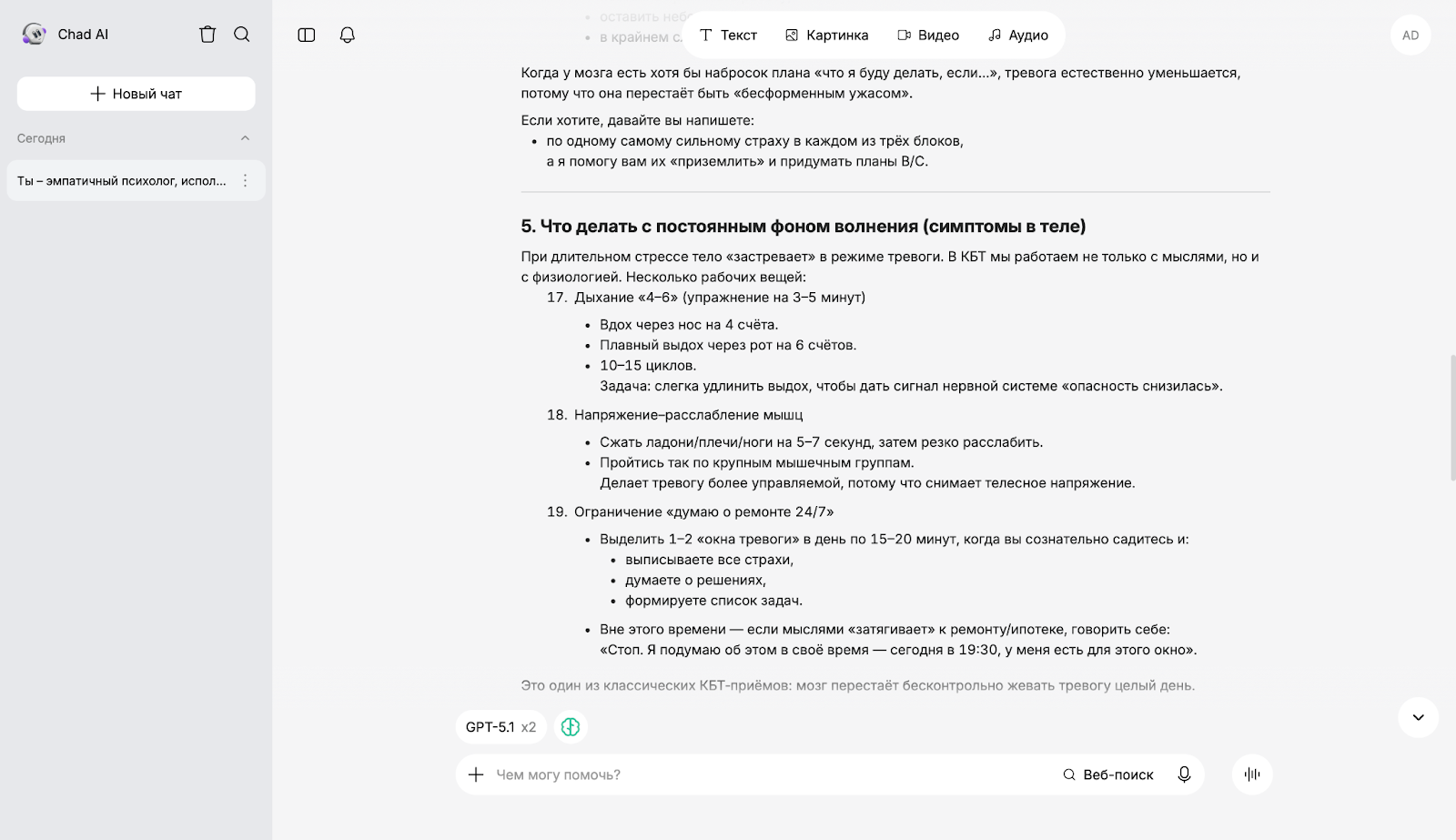 Чтобы оценить, как разные ИИ работают в роли психолога, мы использовали единый промпт: "Ты — эмпатичный психолог, использующий методы когнитивно-поведенческой терапии. Я чувствую сильную тревогу из-за текущего ремонта в квартире, ипотеки, предстоящего переезда. Помоги мне проанализировать мои негативные мысли и избавиться от постоянного волнения".
