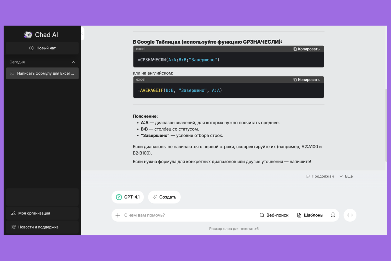 =AVERAGEIF(B:B, «>50», C:C). Причём бот может не только выдать формулу, но и объяснить, как она работает. Это удобно, если вы хотите понять логику или проверить себя.