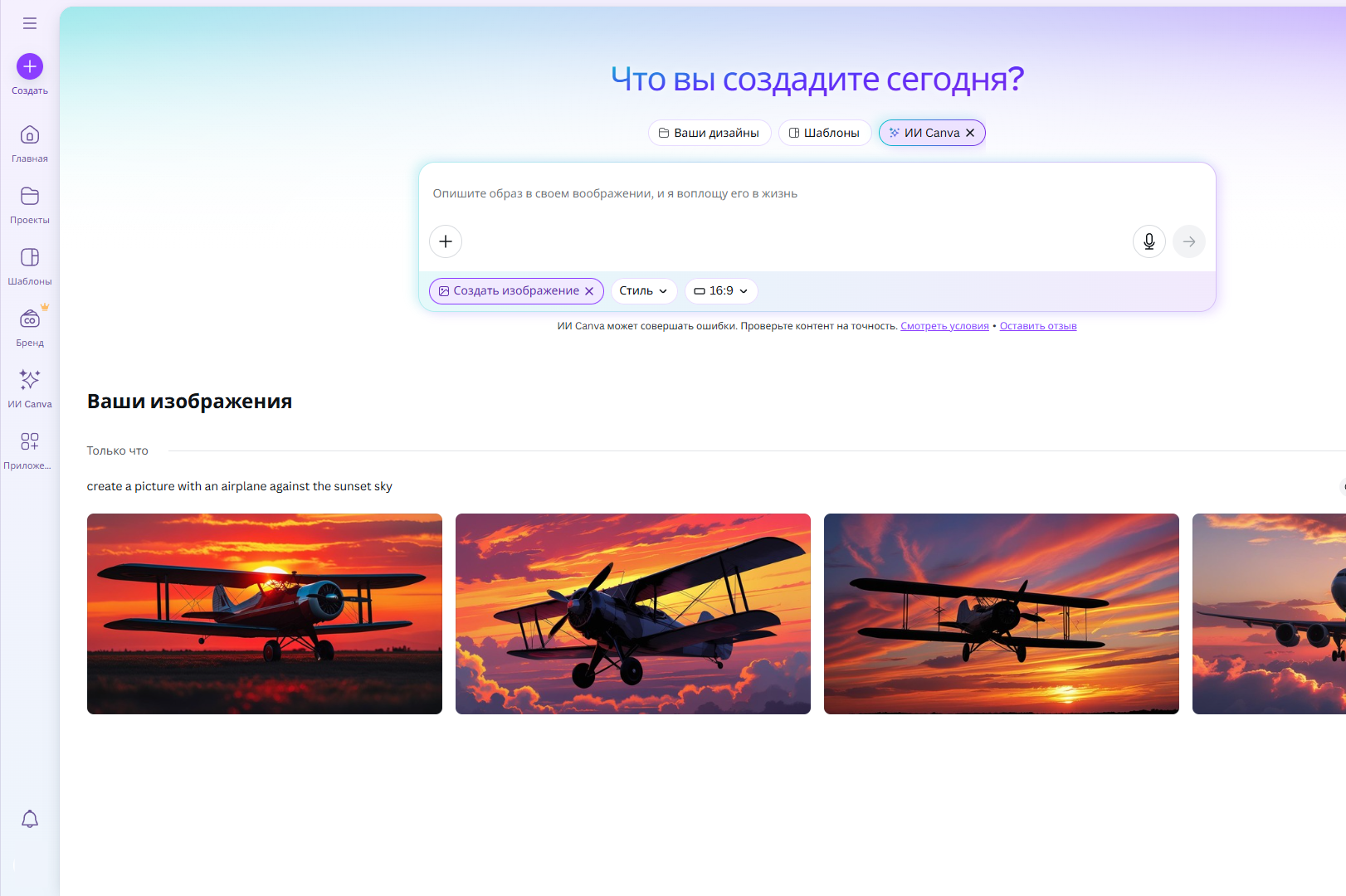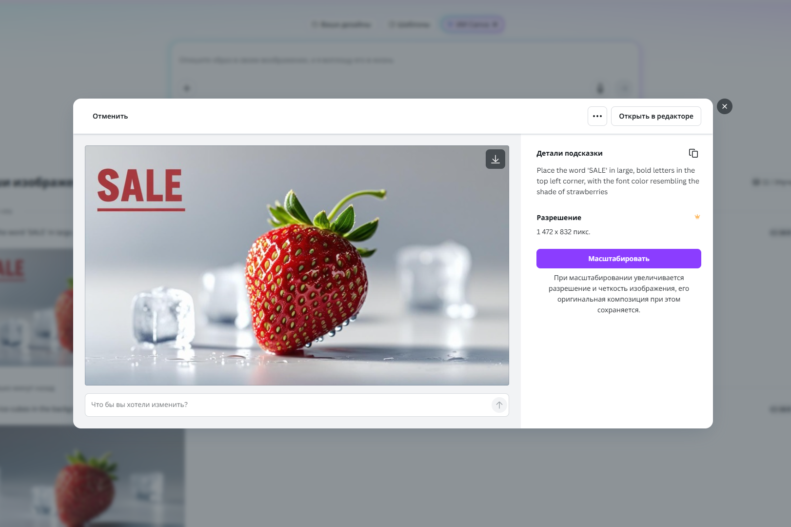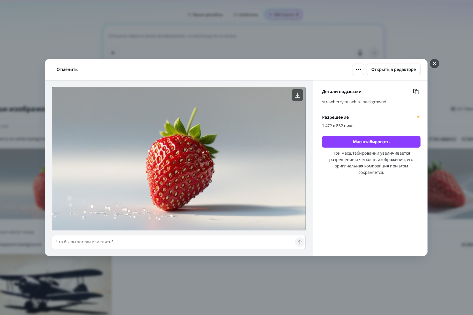 Обратимся к Canva AI и попросим сгенерировать изображение ягоды. Поскольку инструменты WebGPT поддерживают английский, пишем промпт.