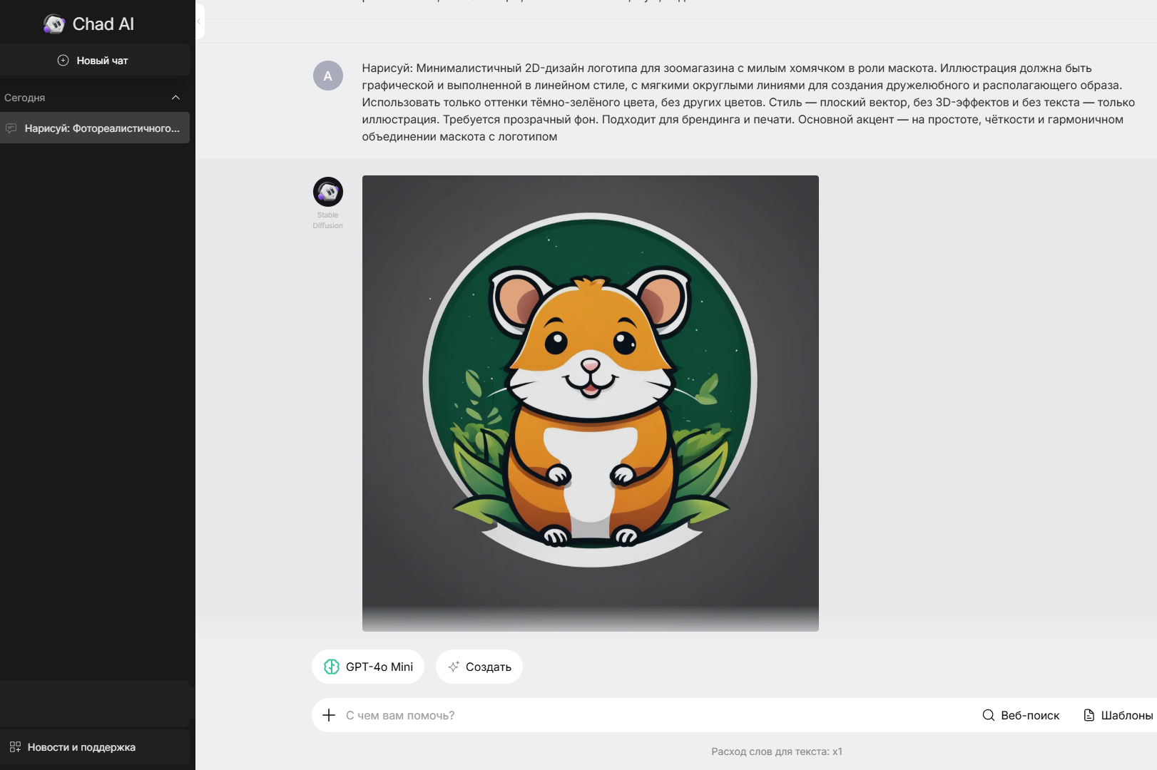 Предположим, что нам нужны идеи для логотипа зоомагазина. Клиент хочет минималистичный дизайн со своим маскотом — хомяком. Фирменные цвета — темно-зеленые оттенки.