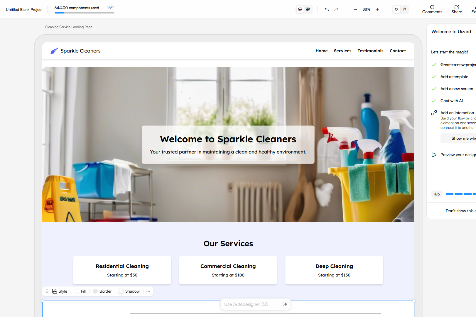 Для ускорения дизайна приложений или сайтов протестируем Uizard. Зададим задачу: сгенерировать макет минималистичного лендинга для клининговой службы.