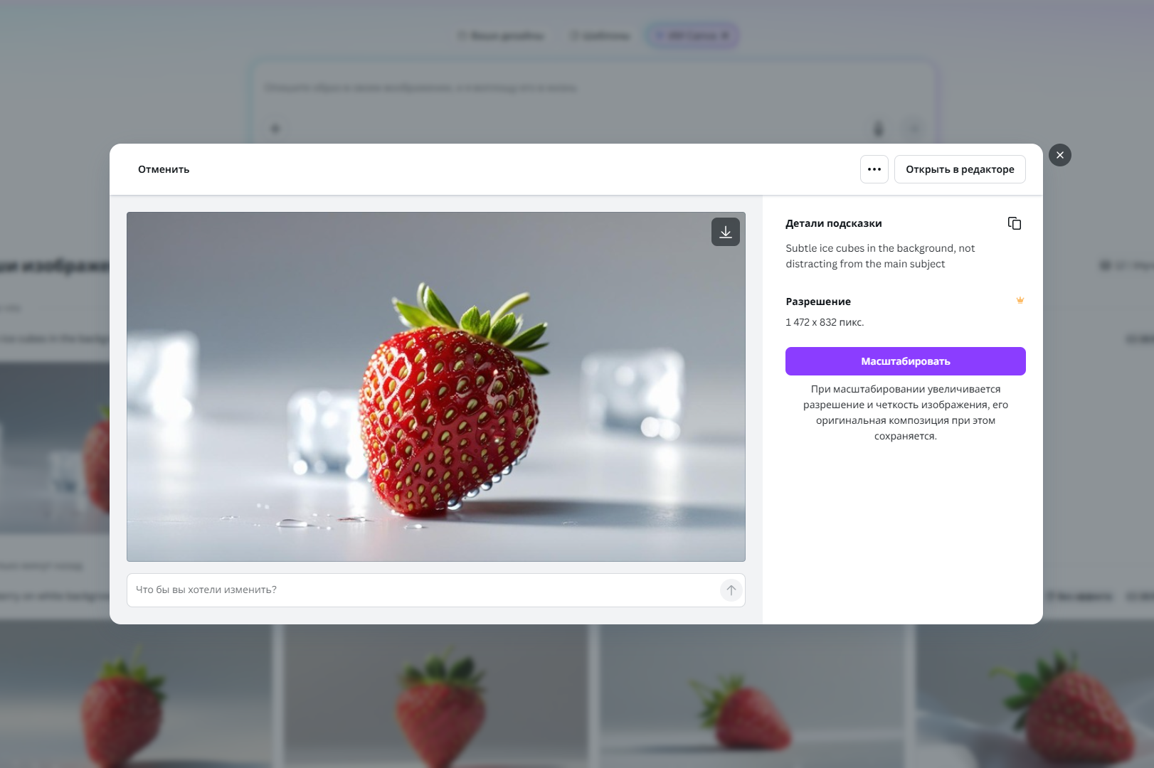 Изображение можно обогатить деталями. Промпт удобно редактировать, внося уточнения. Попросим ассистента добавить на фон кубики льда, чтобы они не перекрывали основное изображение.